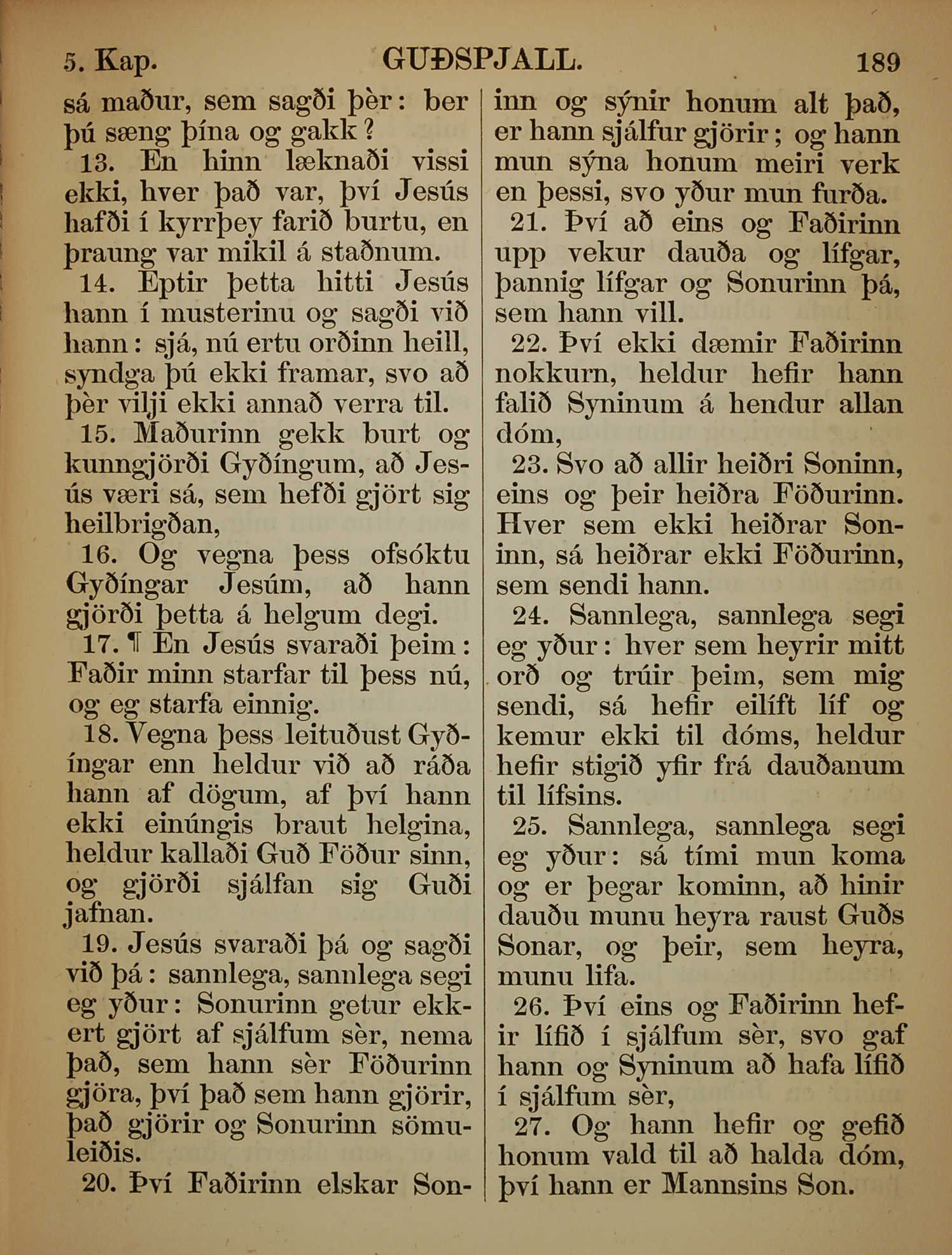 1863年冰島語新約全書 約翰福音 5 章 13 節到 5 章 27 節