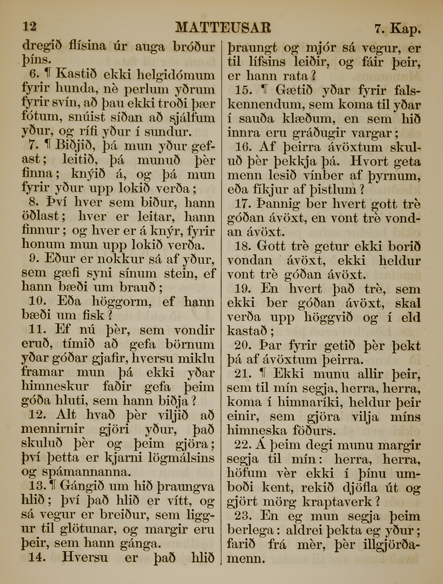 1863年冰島語新約全書 馬太福音 7 章 6 節到 7 章 23 節