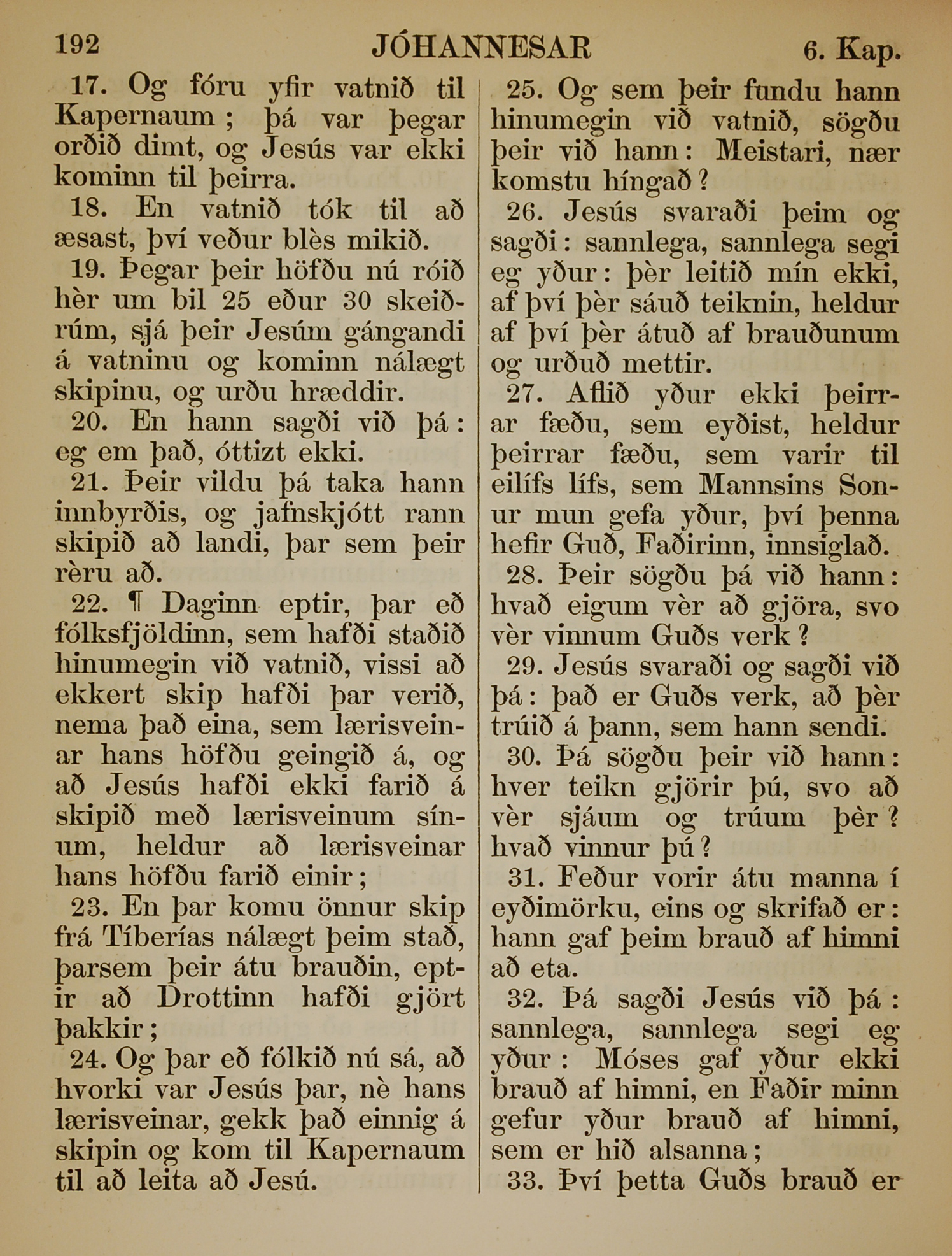 1863年冰島語新約全書 約翰福音 6 章 17 節到 6 章 33 節