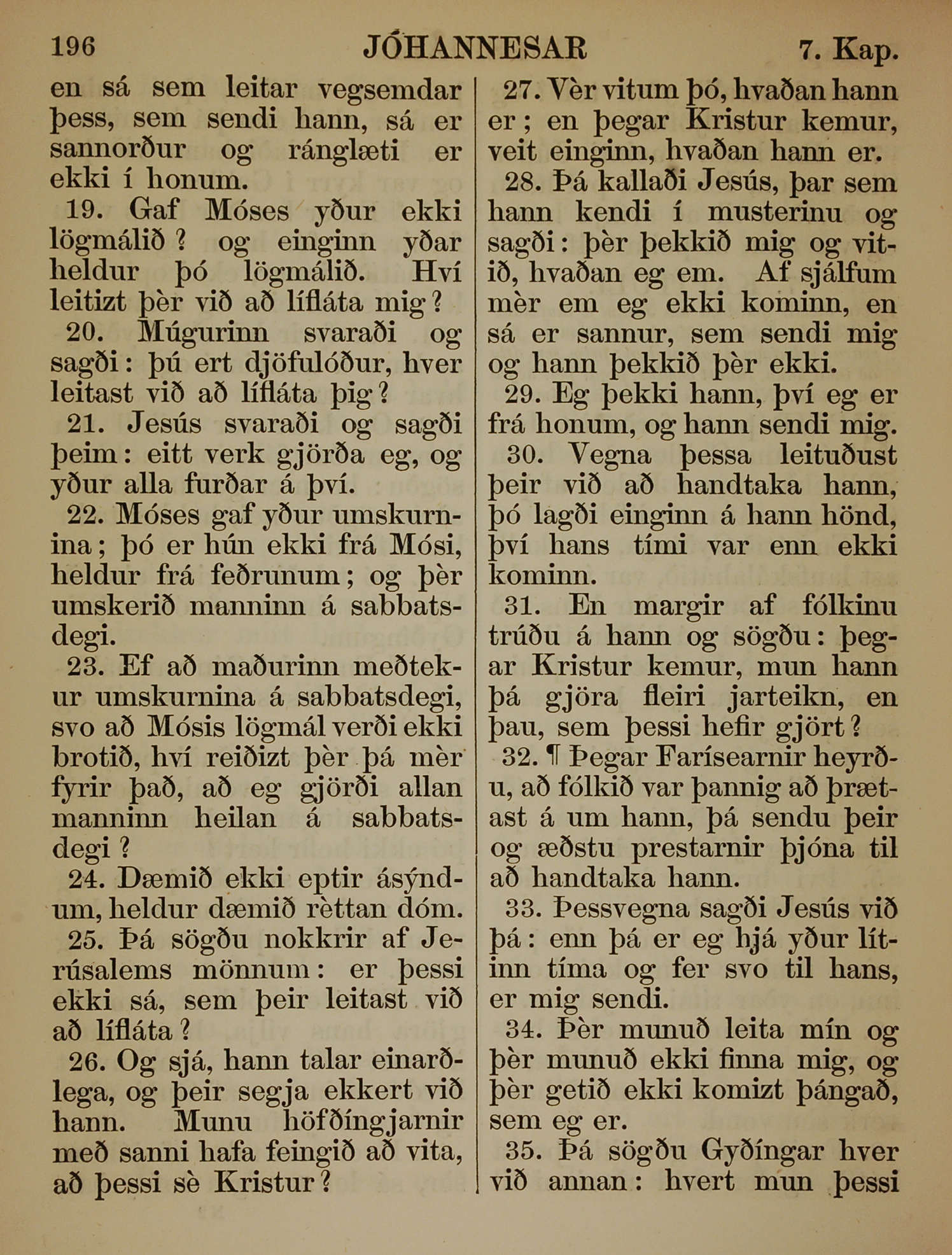 1863年冰島語新約全書 約翰福音 7 章 19 節到 7 章 35 節
