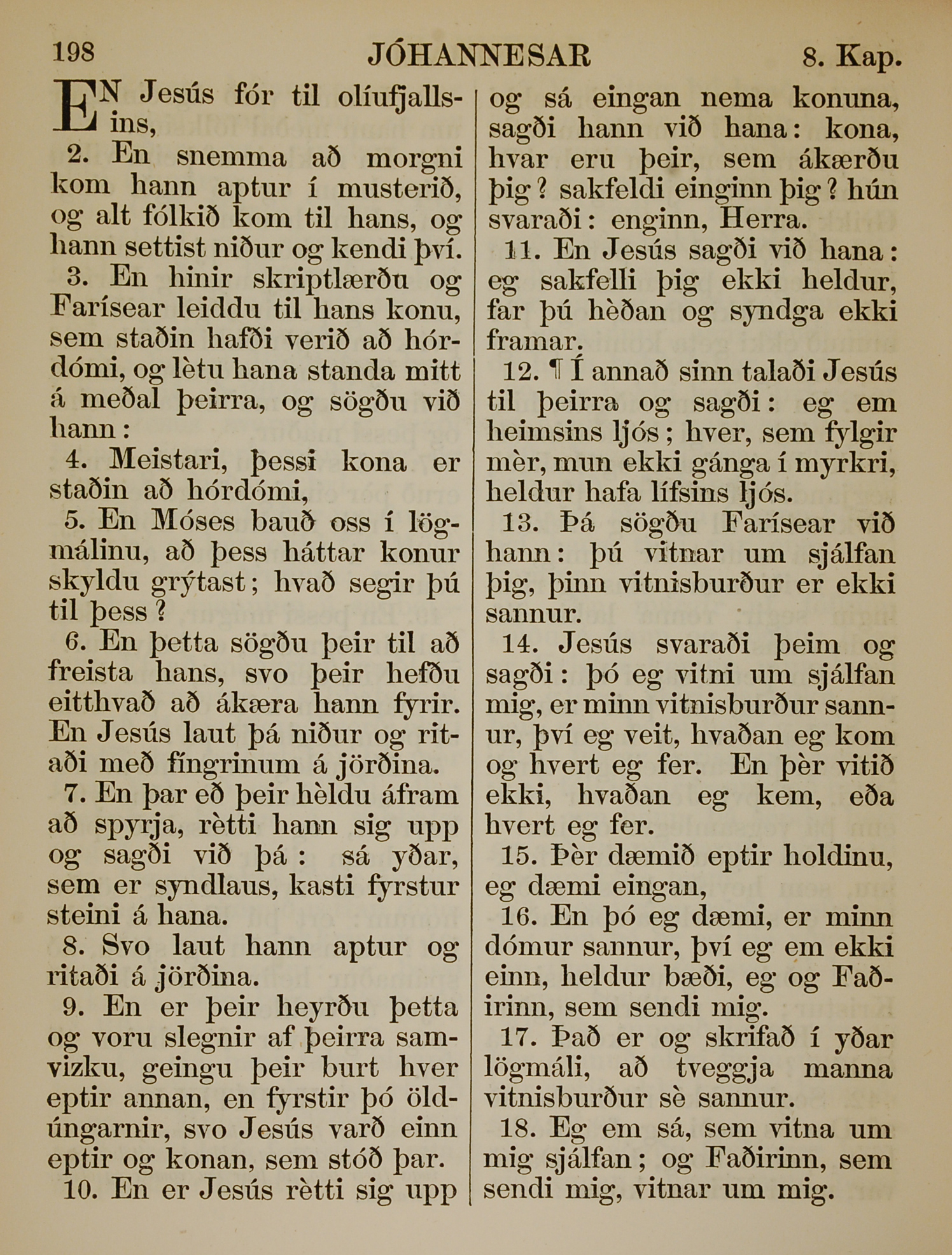 1863年冰島語新約全書 約翰福音 8 章 1 節到 8 章 18 節