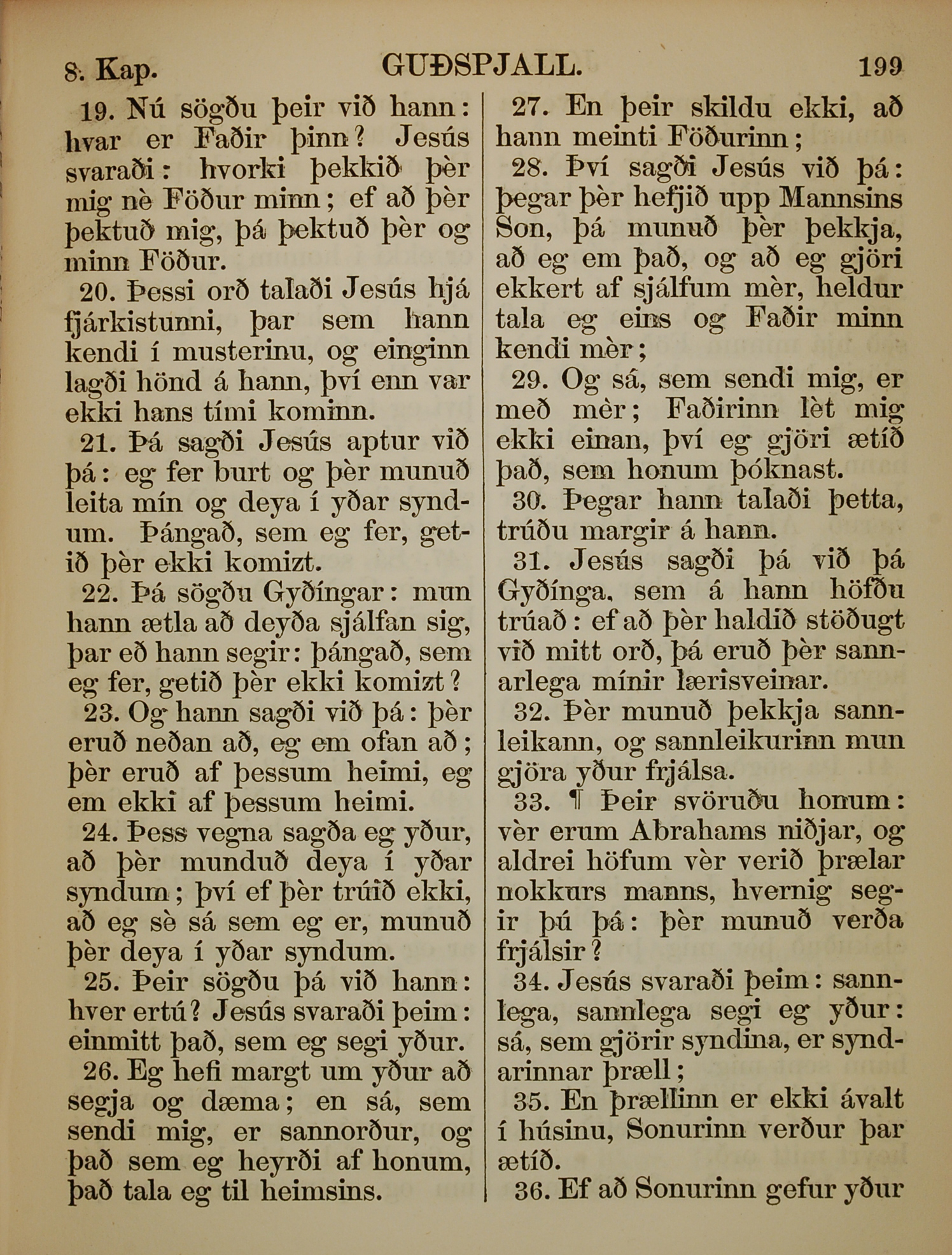 1863年冰島語新約全書 約翰福音 8 章 19 節到 8 章 36 節