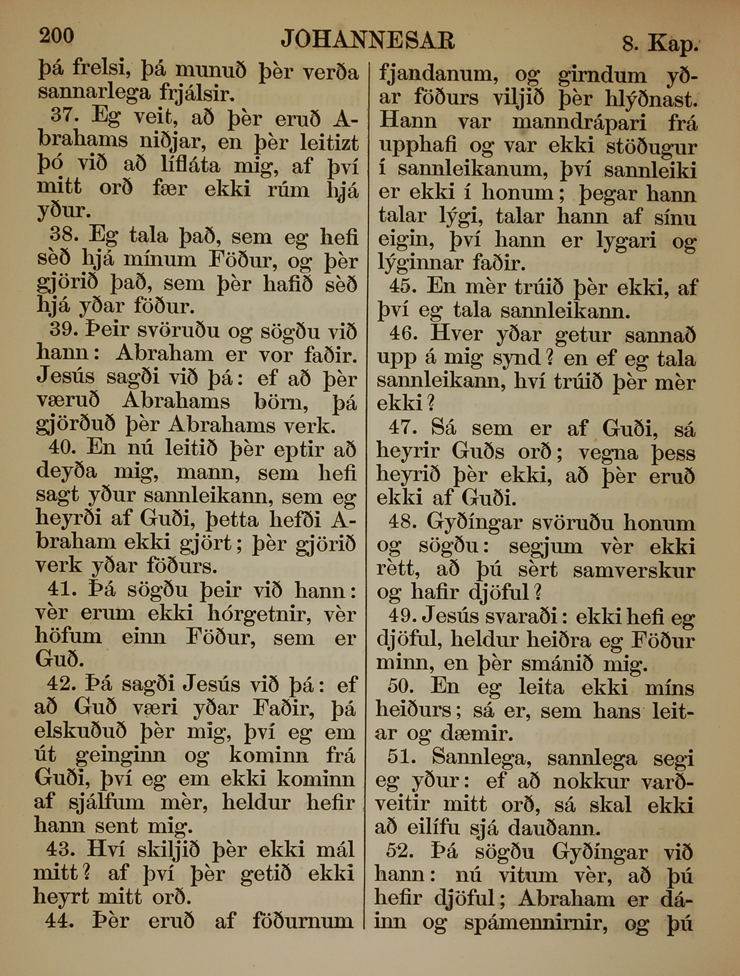 1863年冰島語新約全書 約翰福音 8 章 37 節到 8 章 52 節