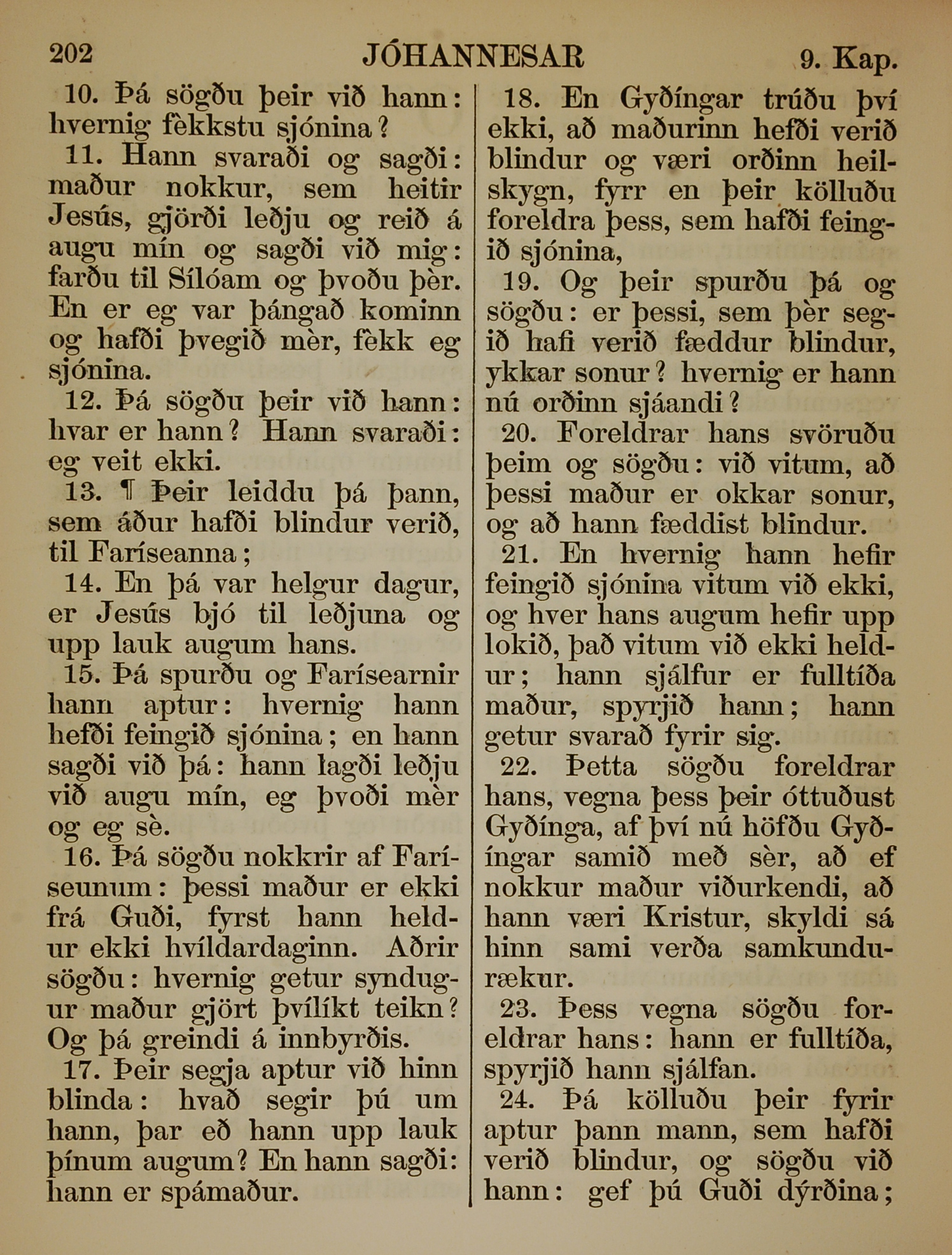 1863年冰島語新約全書 約翰福音 9 章 10 節到 9 章 24 節