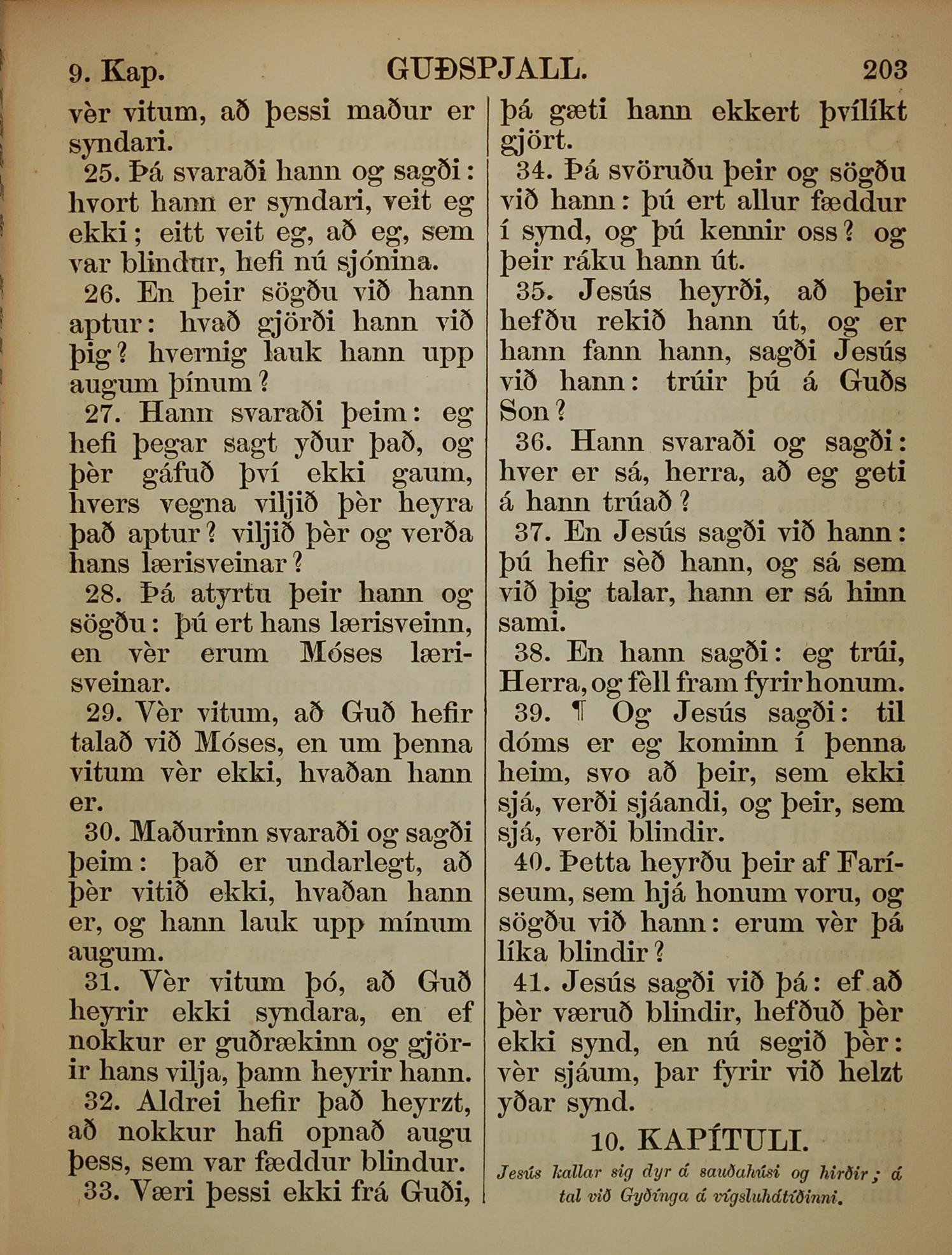 1863年冰島語新約全書 約翰福音 9 章 25 節到 9 章 41 節