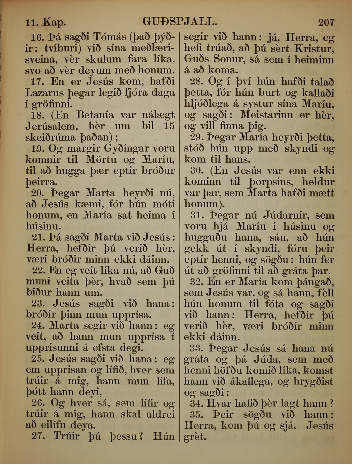1863年冰島語新約全書 約翰福音 11 章 16 節到 11 章 35 節