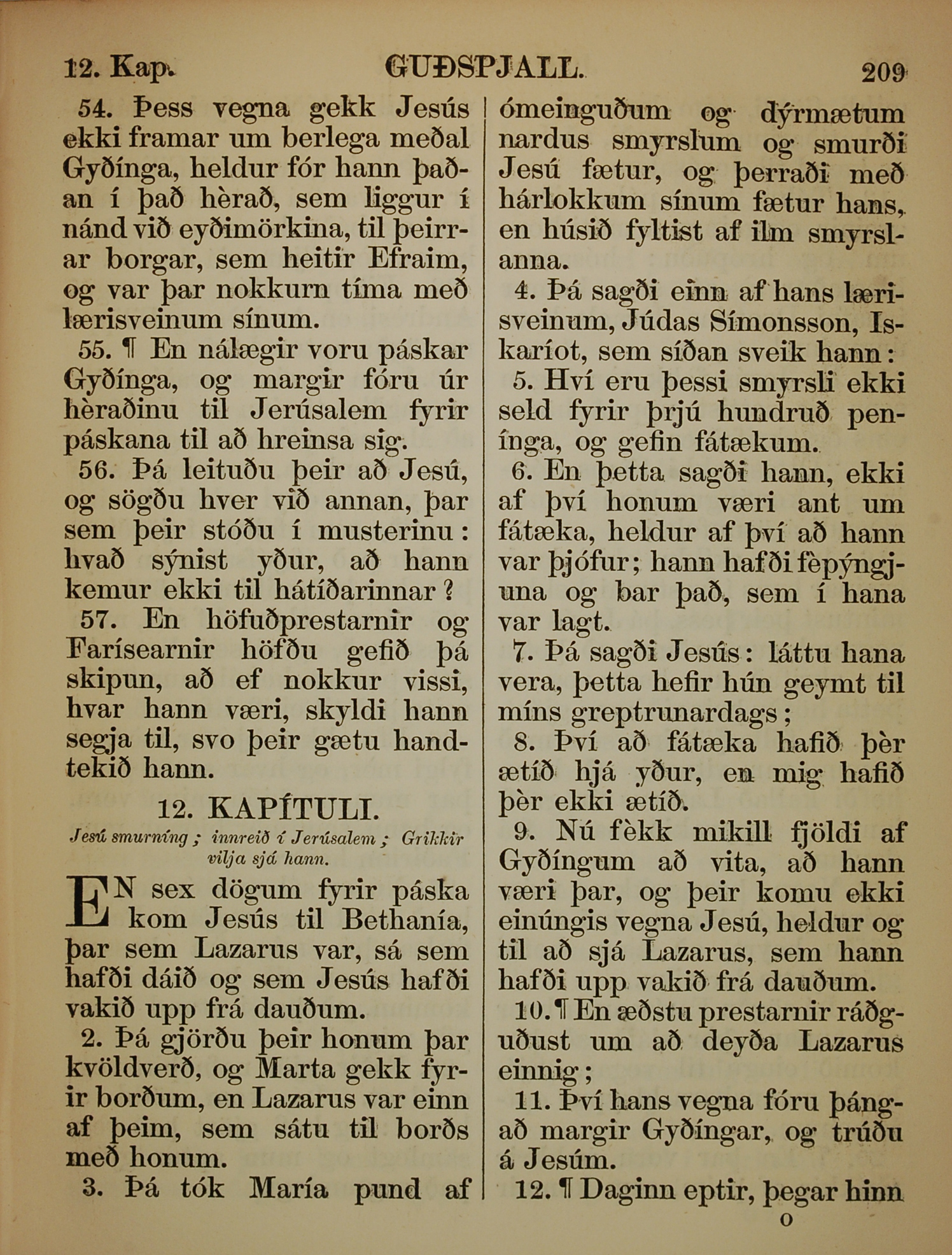 1863年冰島語新約全書 約翰福音 11 章 54 節到 12 章 12 節