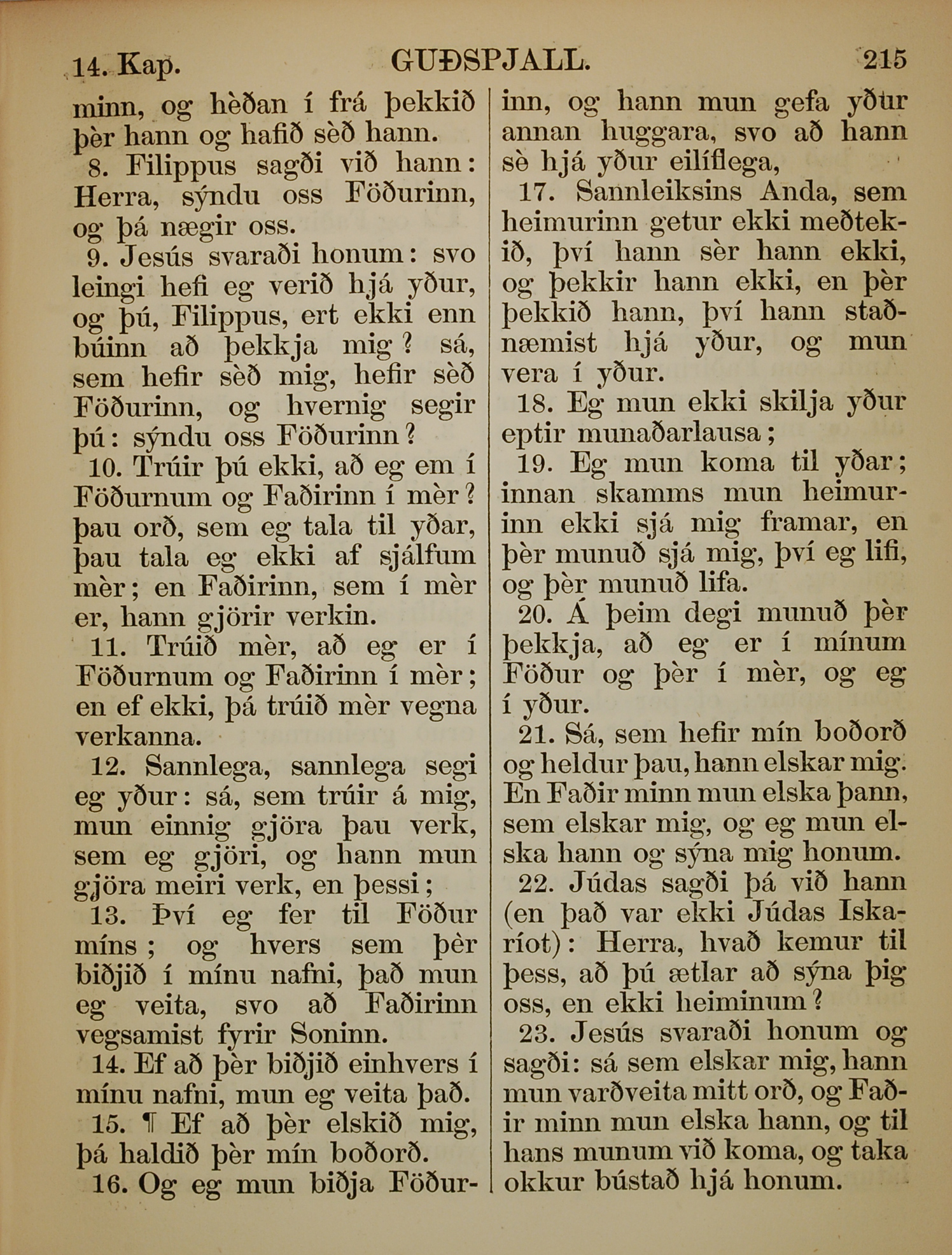 1863年冰島語新約全書 約翰福音 14 章 8 節到 14 章 23 節