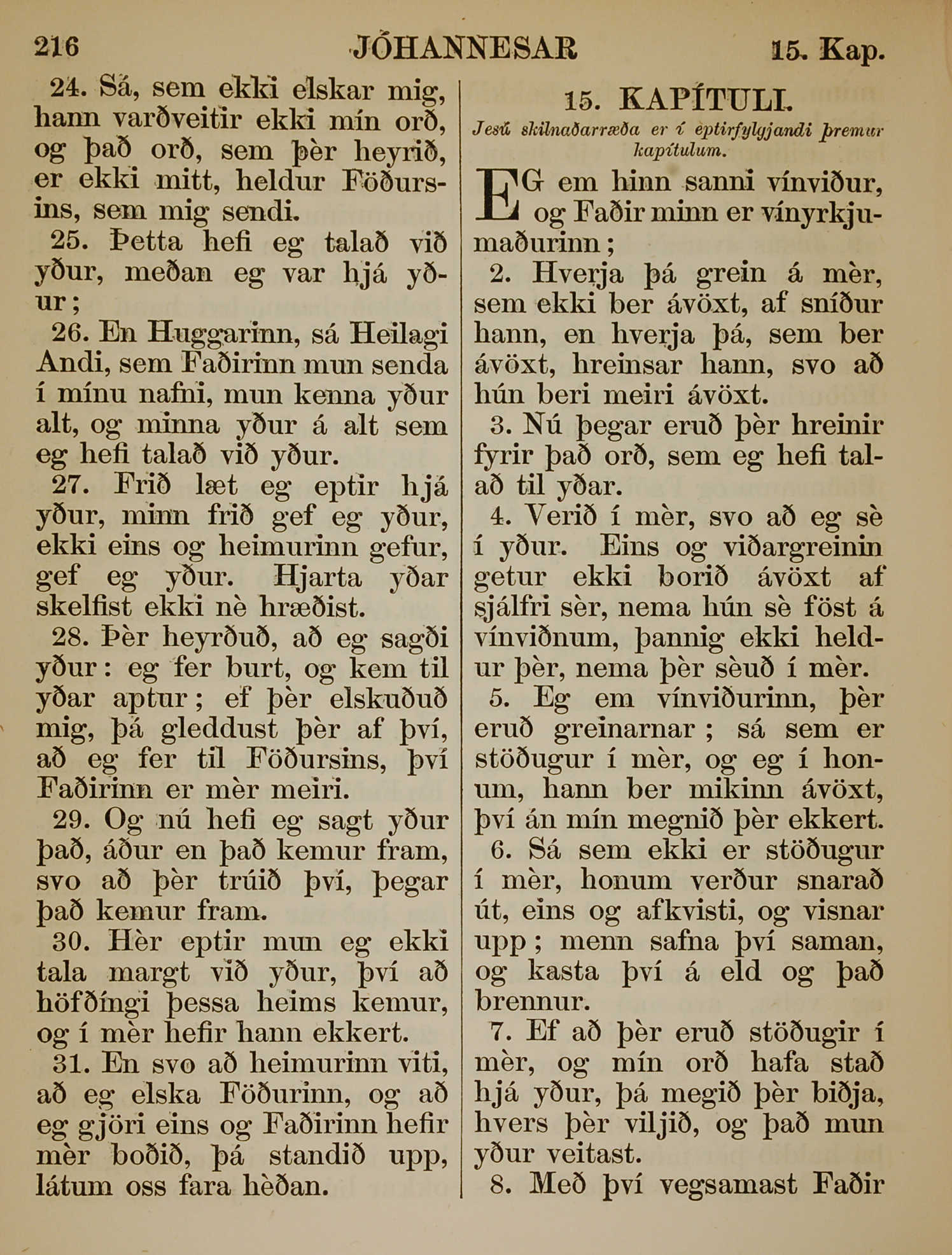 1863年冰島語新約全書 約翰福音 14 章 24 節到 15 章 8 節