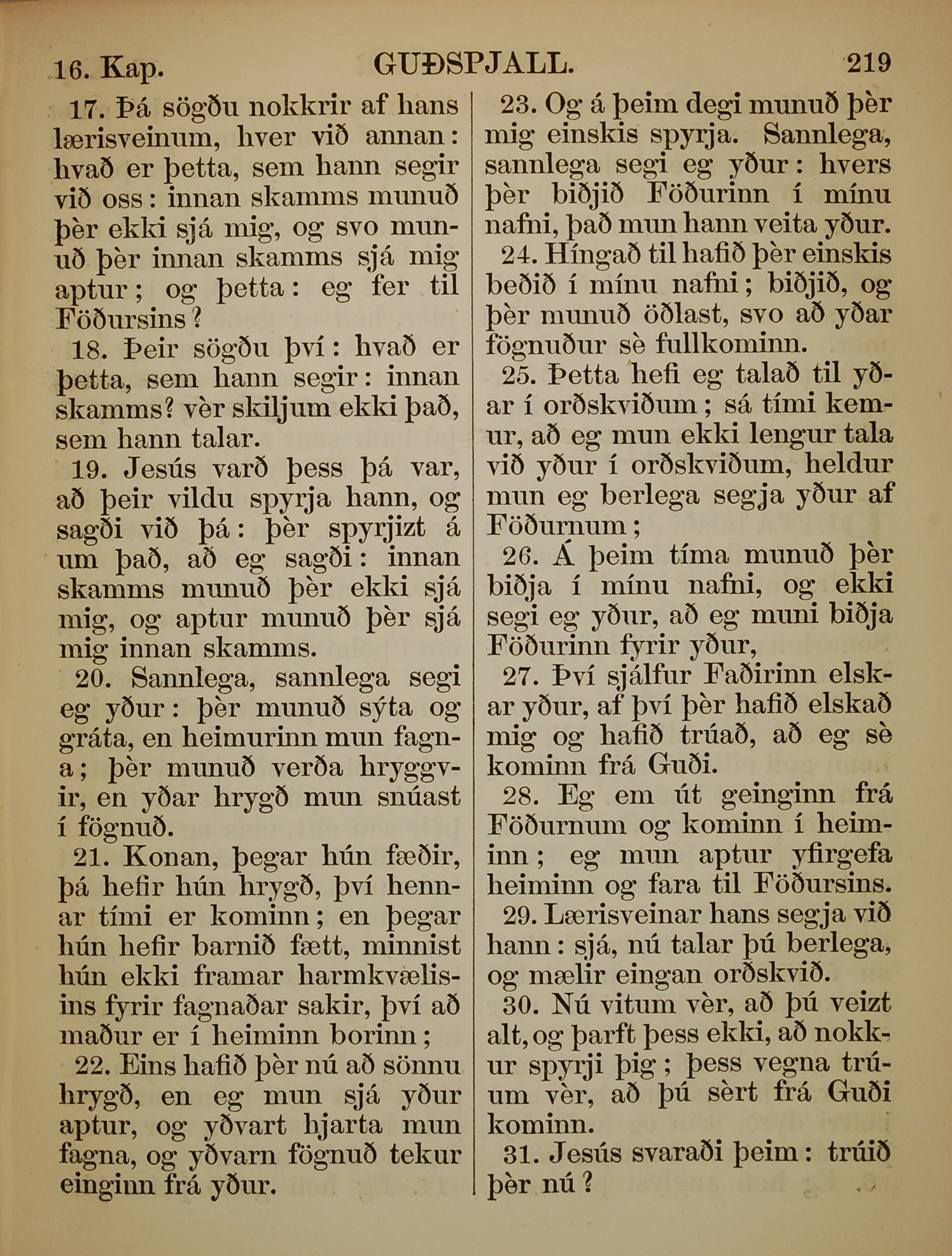 1863年冰島語新約全書 約翰福音 16 章 17 節到 16 章 31 節