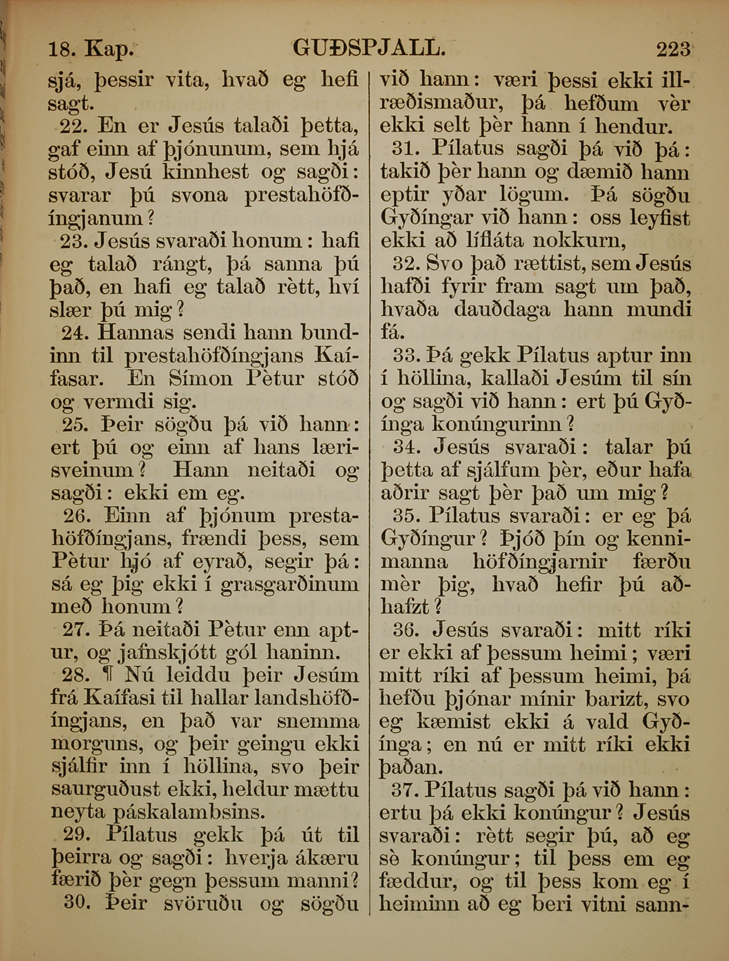 1863年冰島語新約全書 約翰福音 18 章 22 節到 18 章 37 節