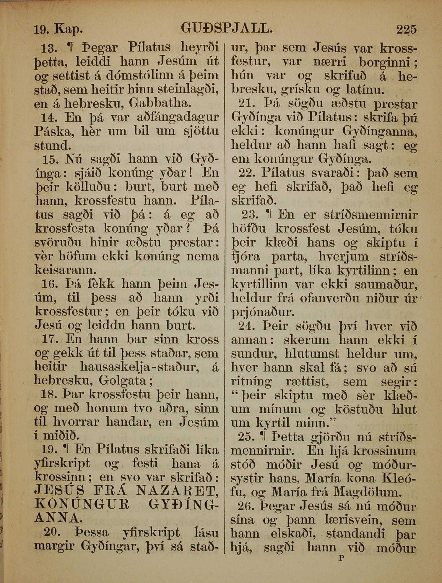 1863年冰島語新約全書 約翰福音 19 章 13 節到 19 章 26 節