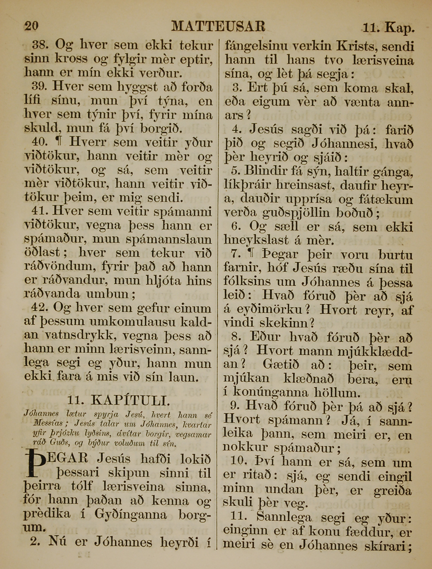1863年冰島語新約全書 馬太福音 10 章 38 節到 11 章 11 節