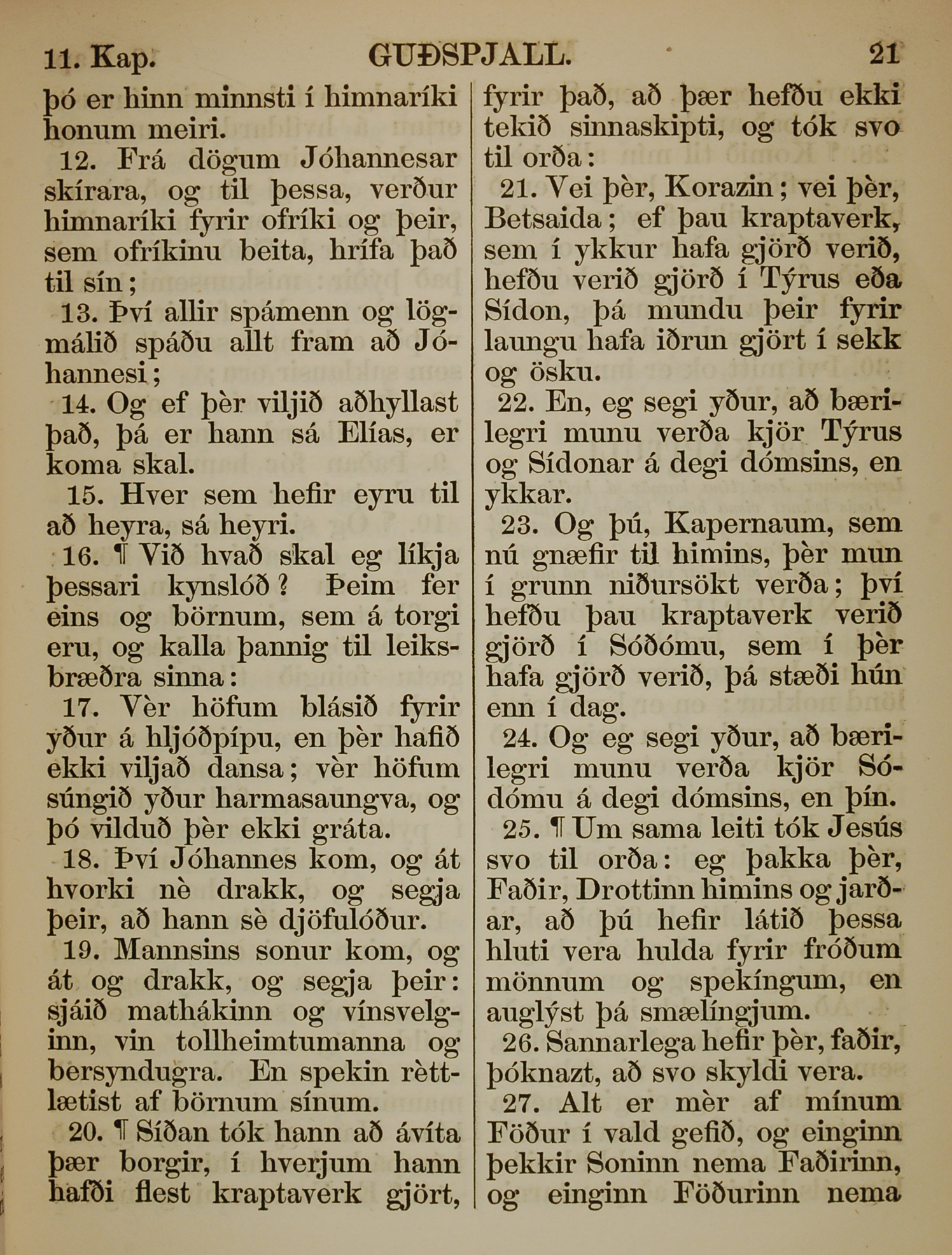 1863年冰島語新約全書 馬太福音 11 章 12 節到 11 章 27 節
