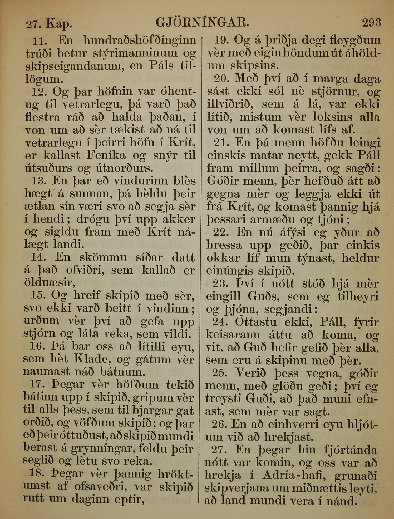 1863年冰島語新約全書 使徒行傳 27 章 11 節到 27 章 27 節