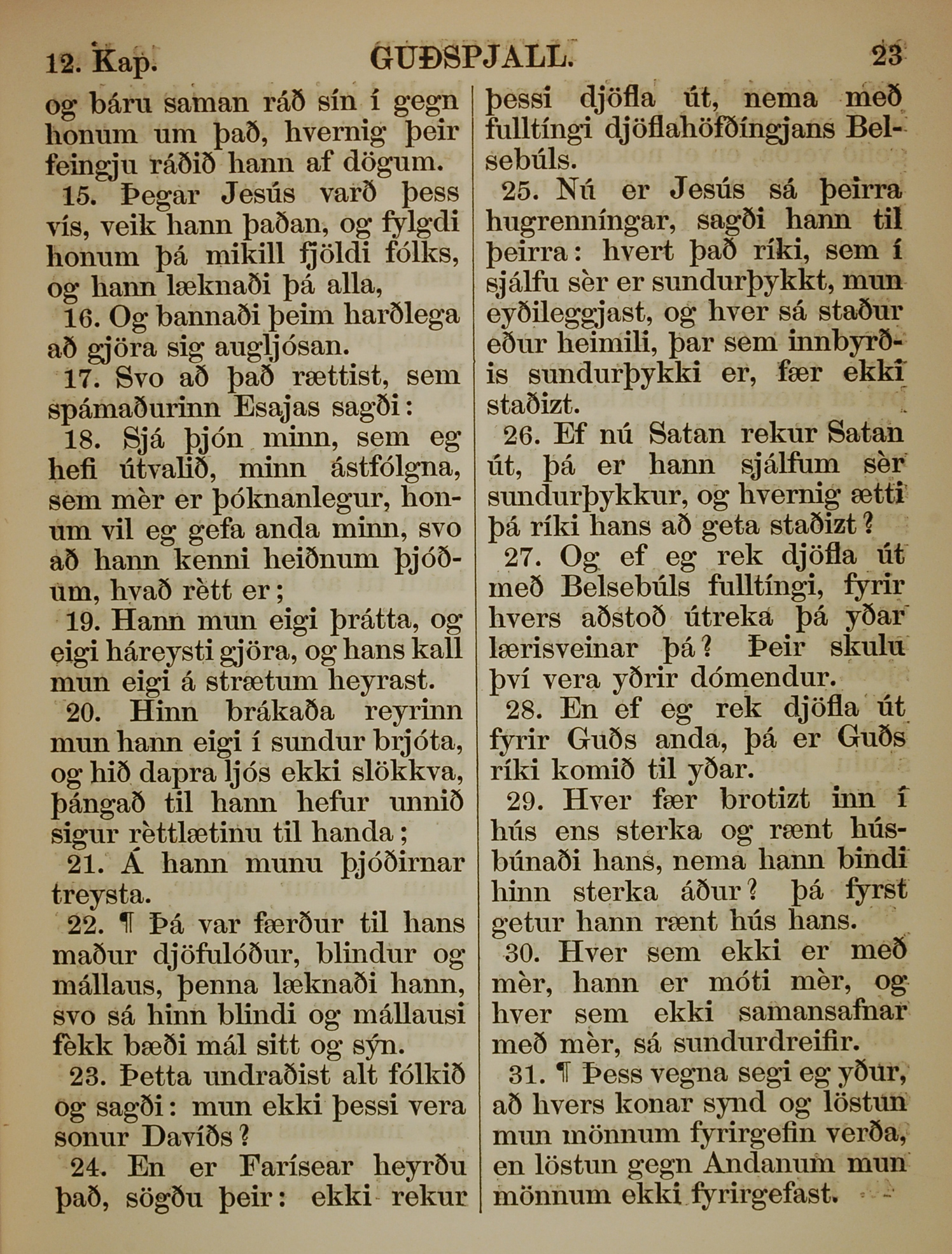 1863年冰島語新約全書 馬太福音 12 章 15 節到 12 章 31 節