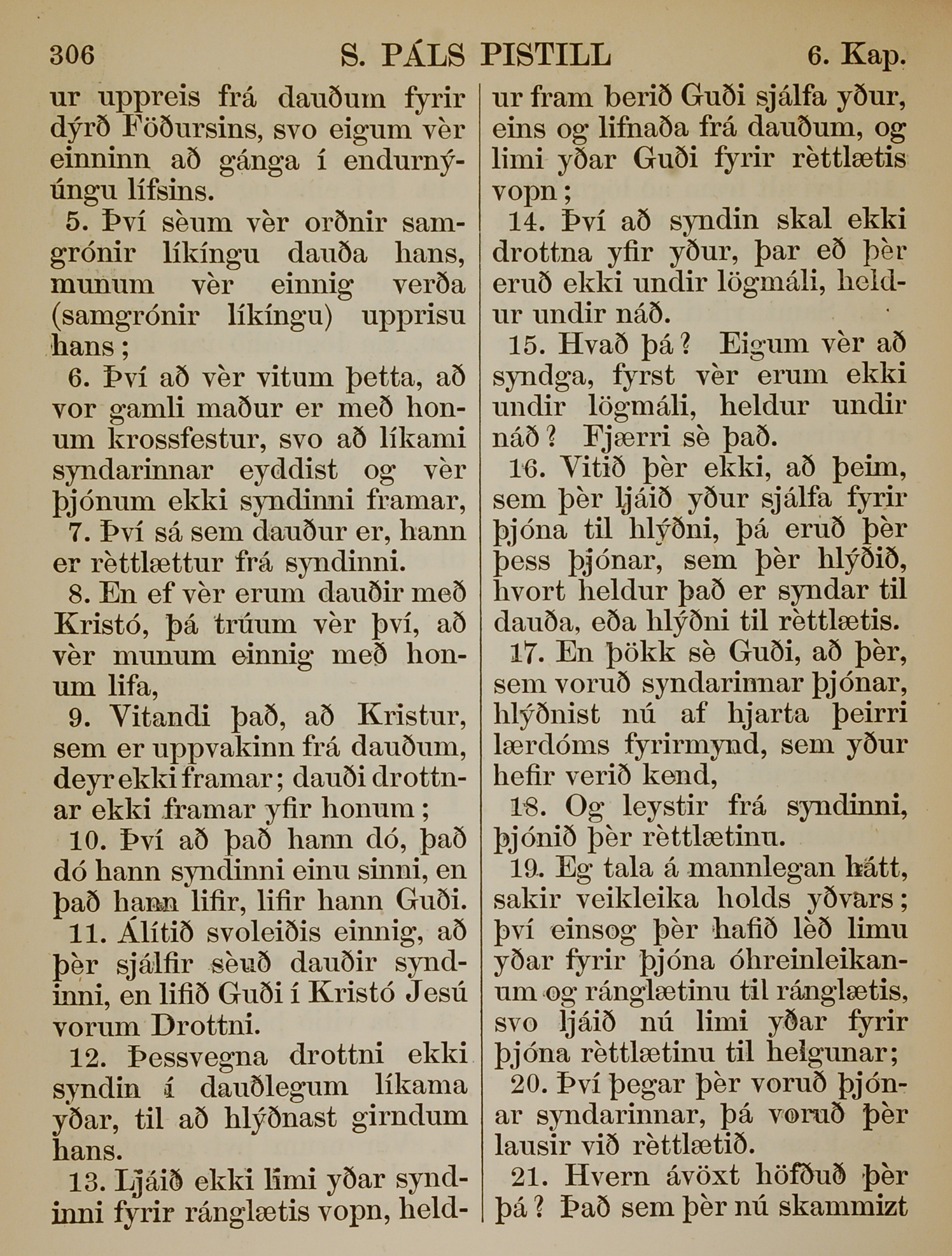 1863年冰島語新約全書 羅馬書 6 章 5 節到 6 章 21 節