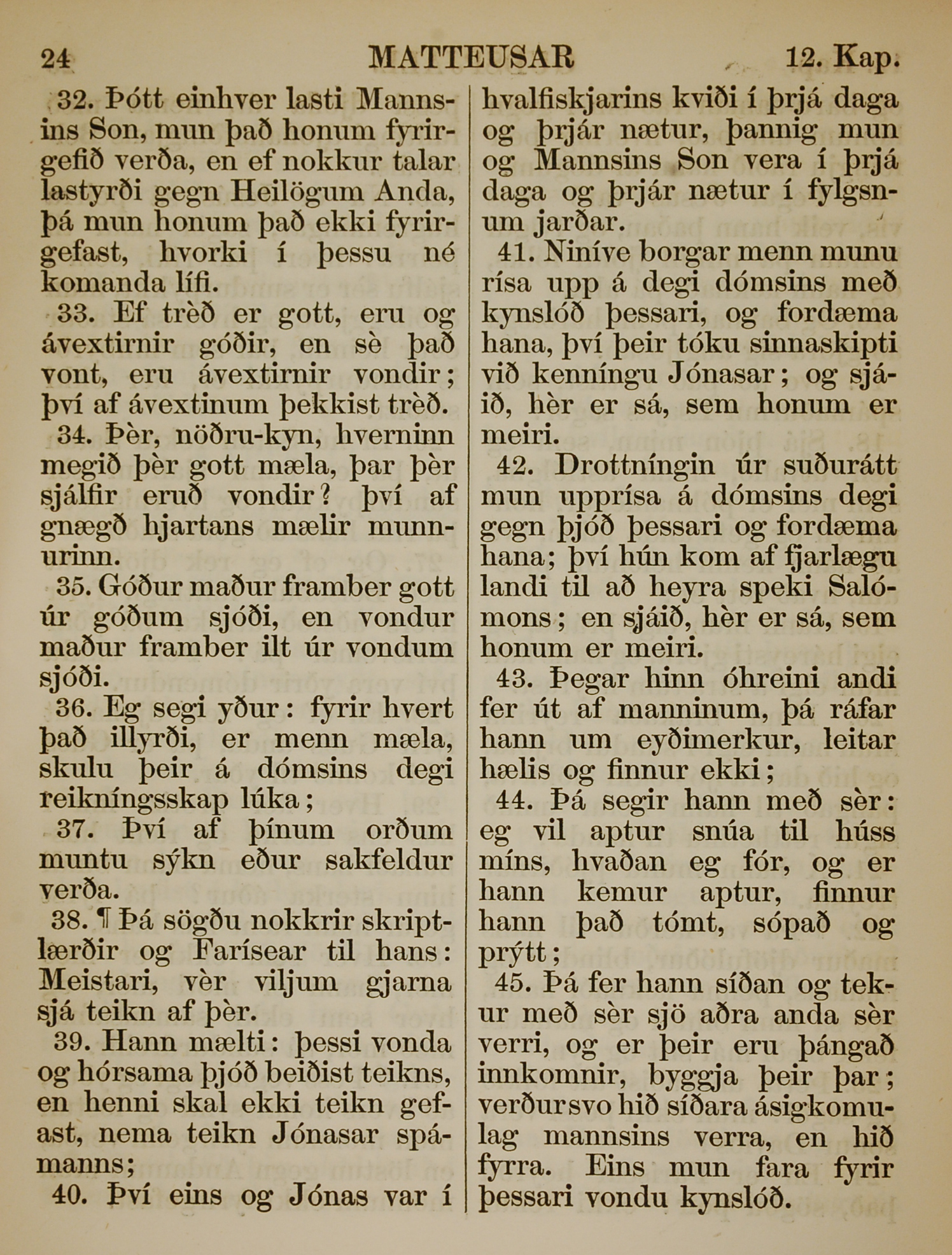 1863年冰島語新約全書 馬太福音 12 章 32 節到 12 章 45 節