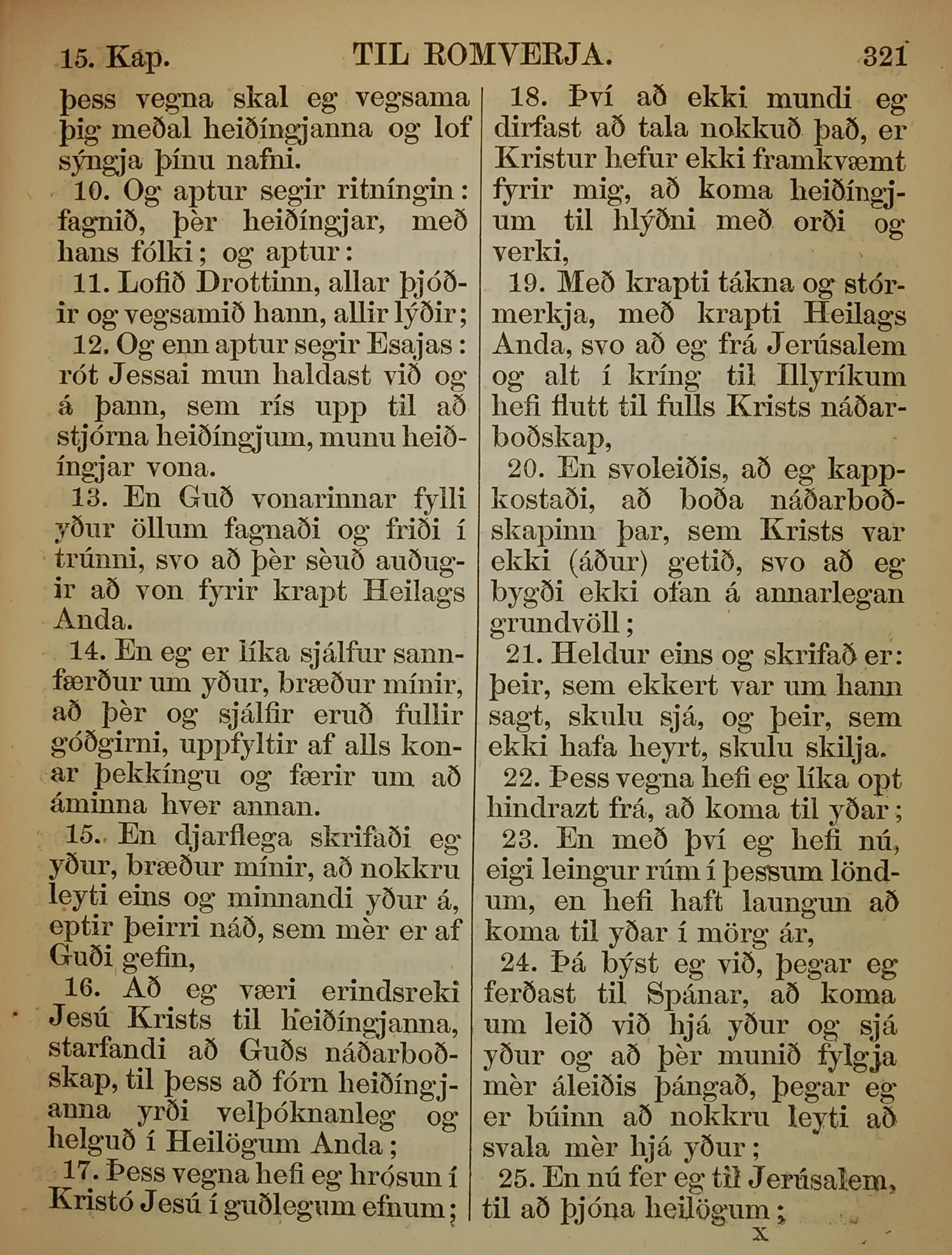 1863年冰島語新約全書 羅馬書 15 章 10 節到 15 章 25 節