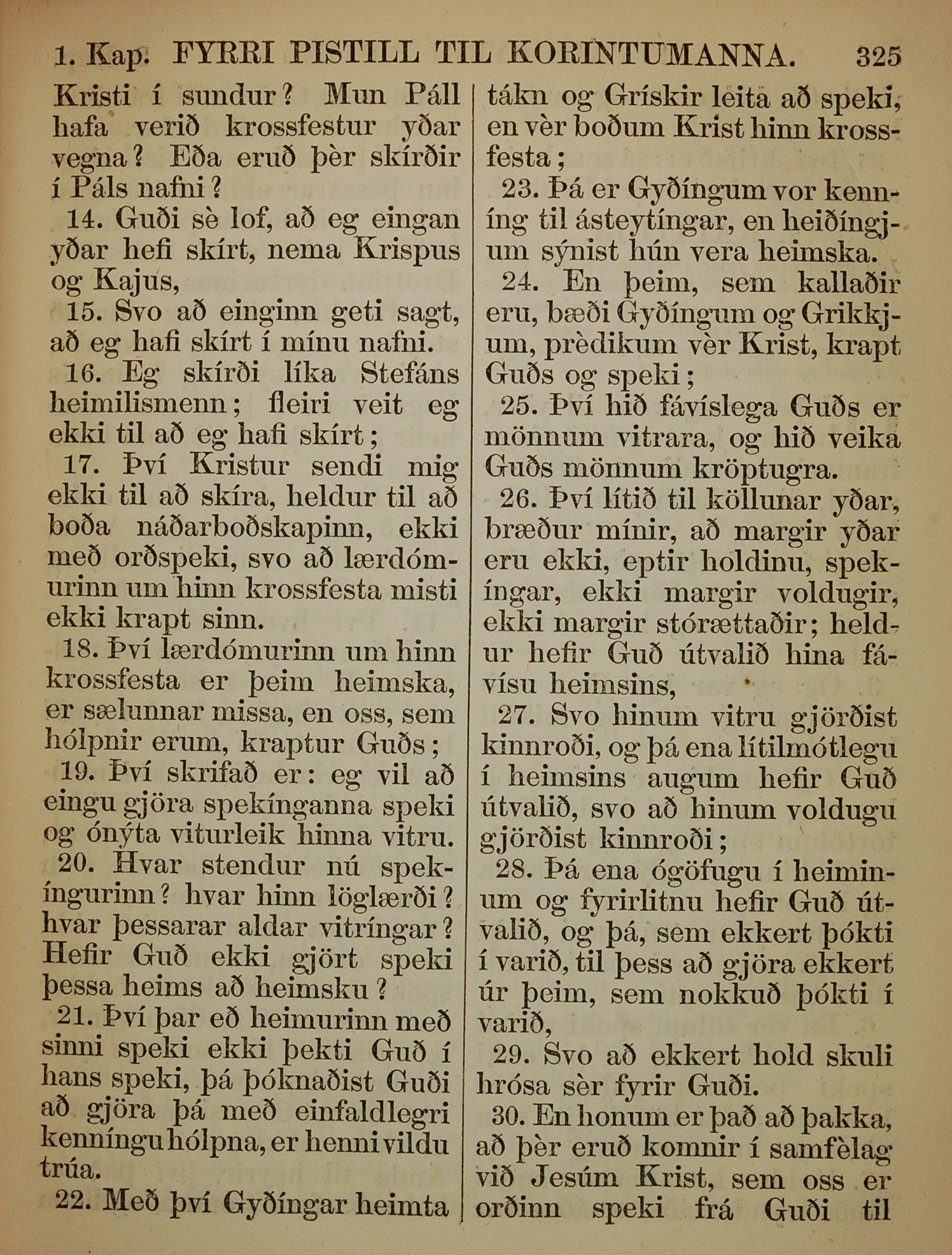 1863年冰島語新約全書 哥林多前書 1 章 14 節到 1 章 30 節