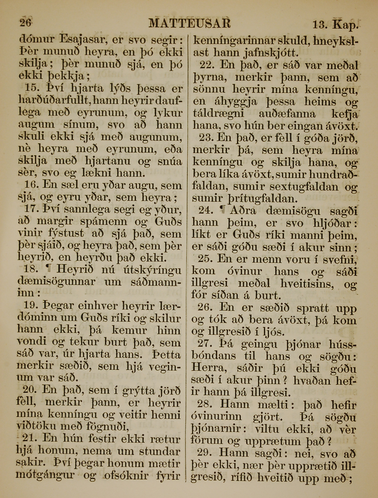 1863年冰島語新約全書 馬太福音 13 章 15 節到 13 章 29 節