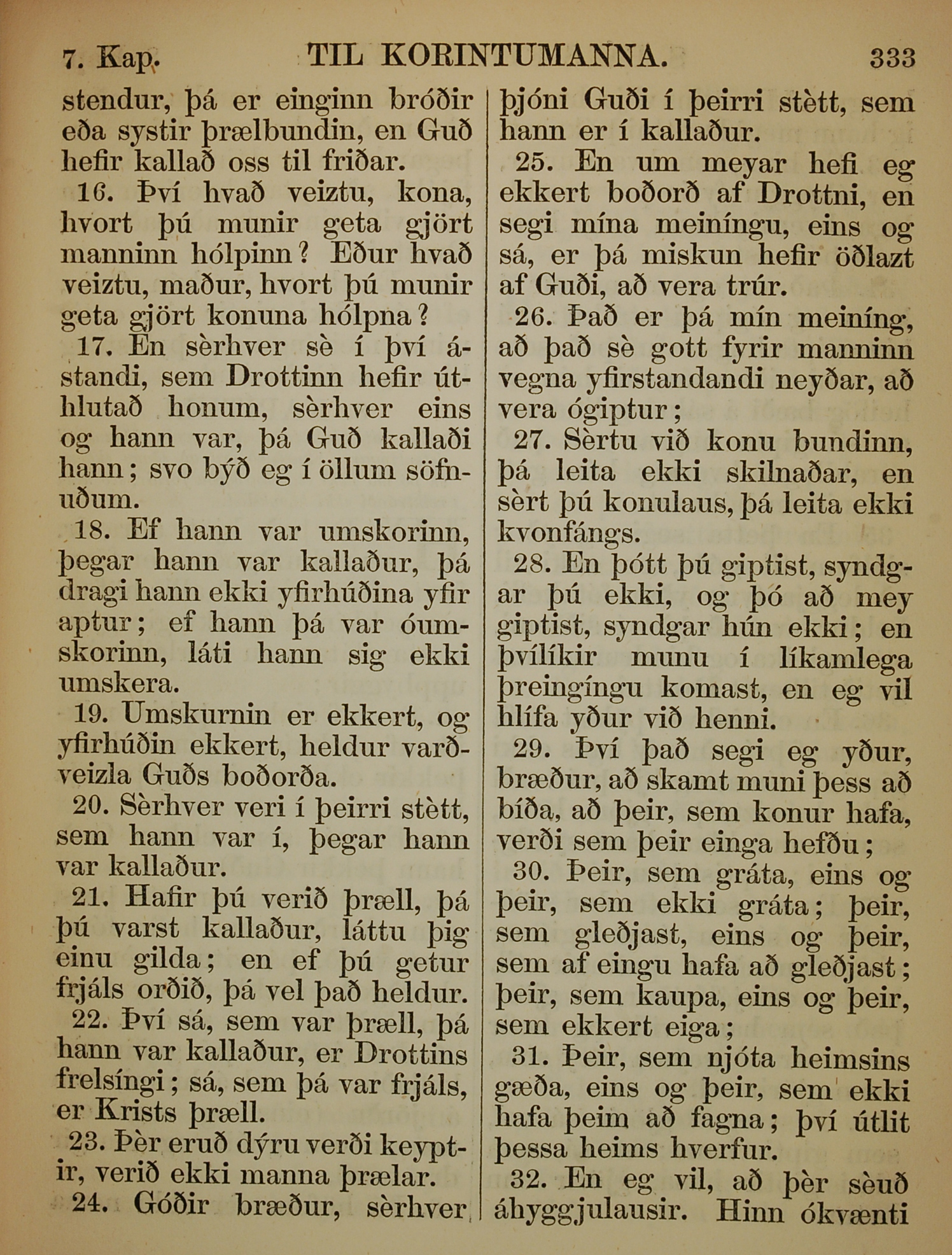 1863年冰島語新約全書 哥林多前書 7 章 16 節到 7 章 32 節