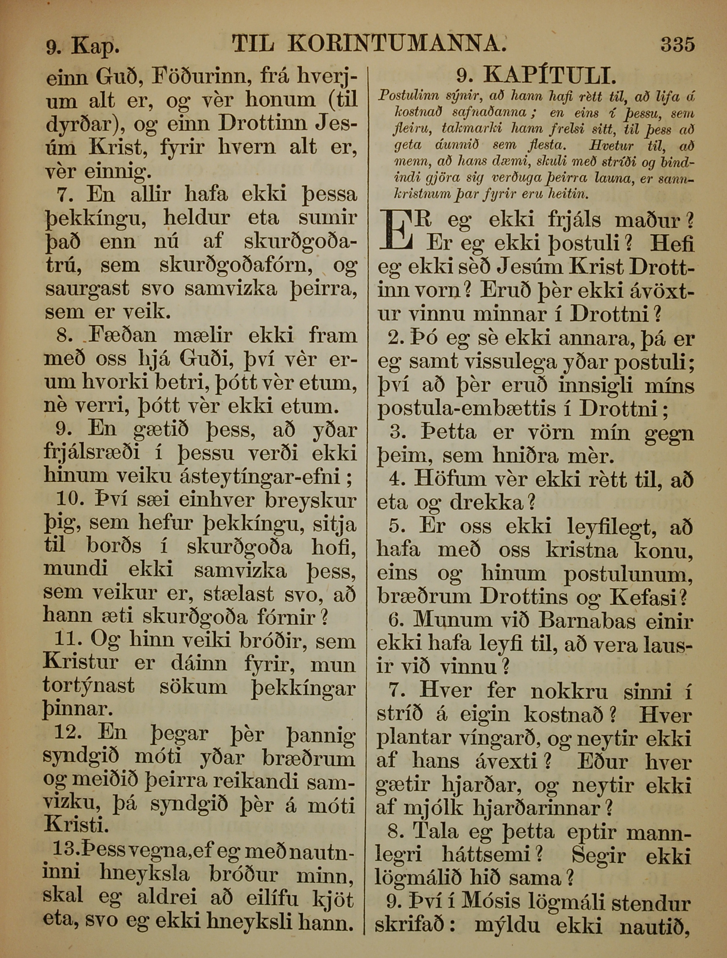 1863年冰島語新約全書 哥林多前書 8 章 7 節到 9 章 9 節