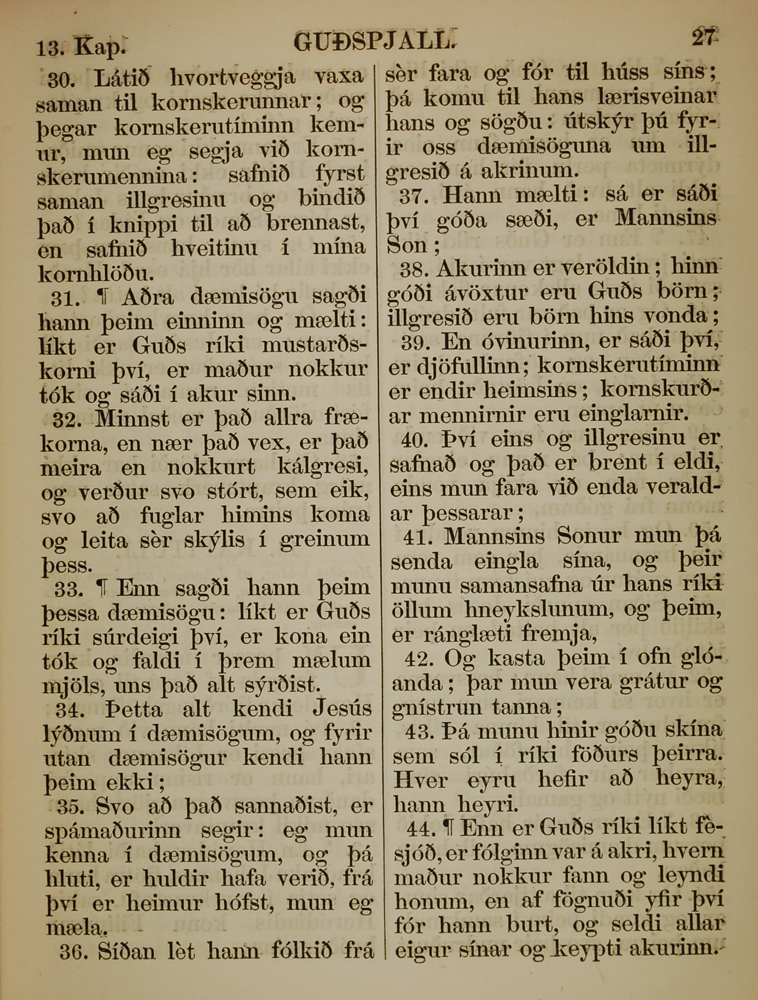 1863年冰島語新約全書 馬太福音 13 章 30 節到 13 章 44 節