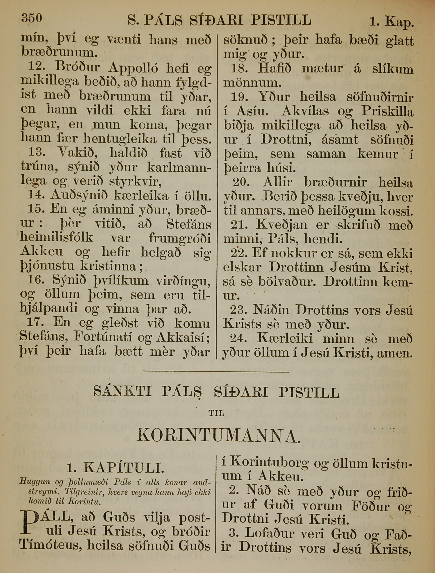 1863年冰島語新約全書 哥林多前書 16 章 12 節到 16 章 24 節