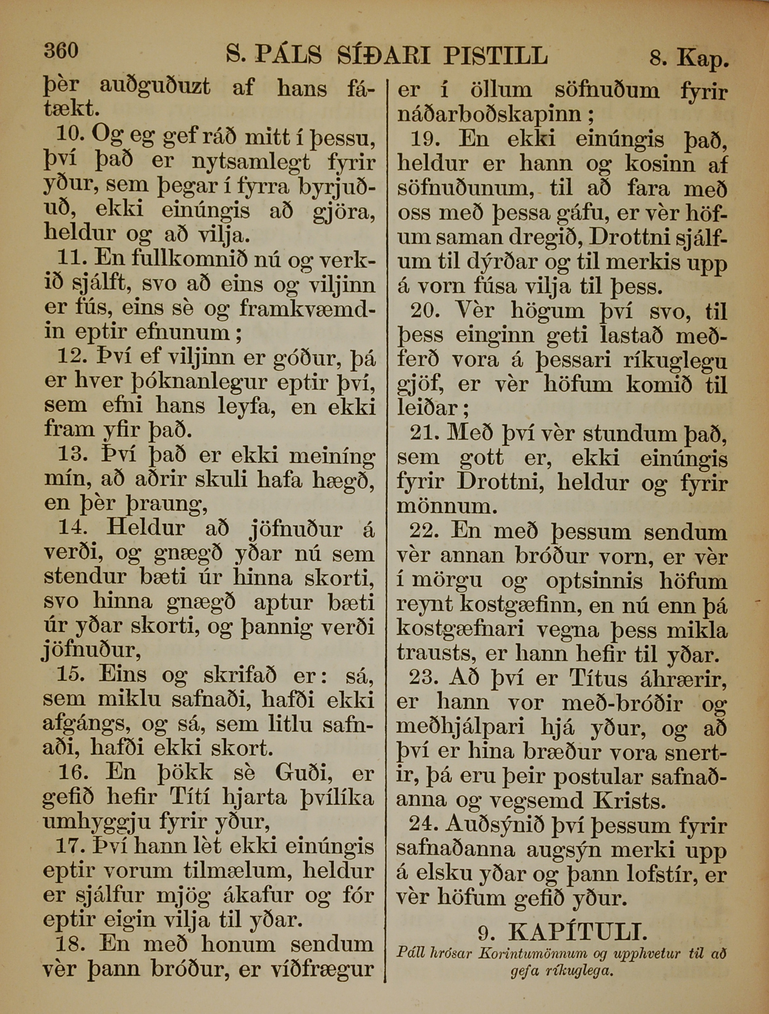 1863年冰島語新約全書 哥林多後書 8 章 10 節到 8 章 24 節