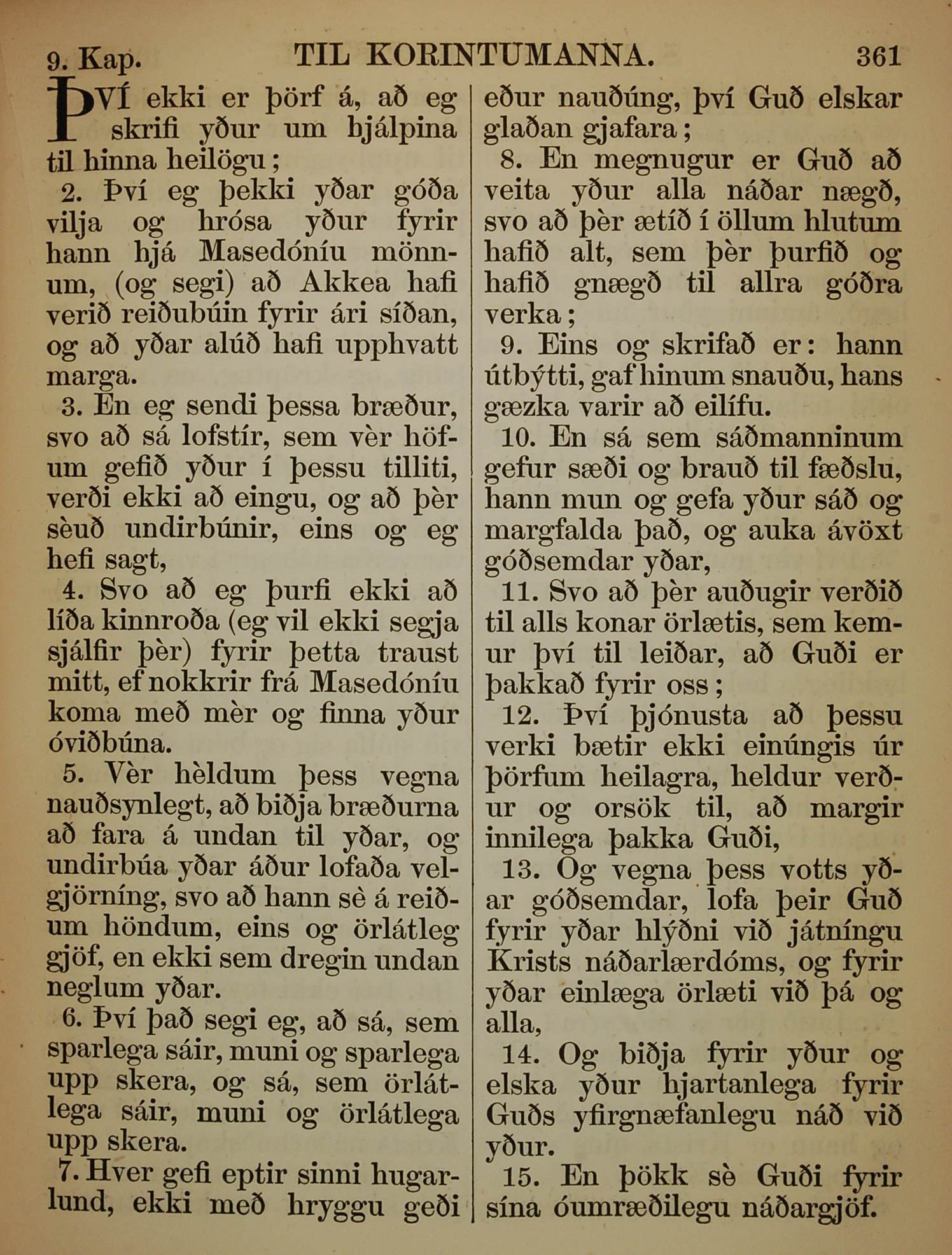1863年冰島語新約全書 哥林多後書 9 章 1 節到 9 章 15 節