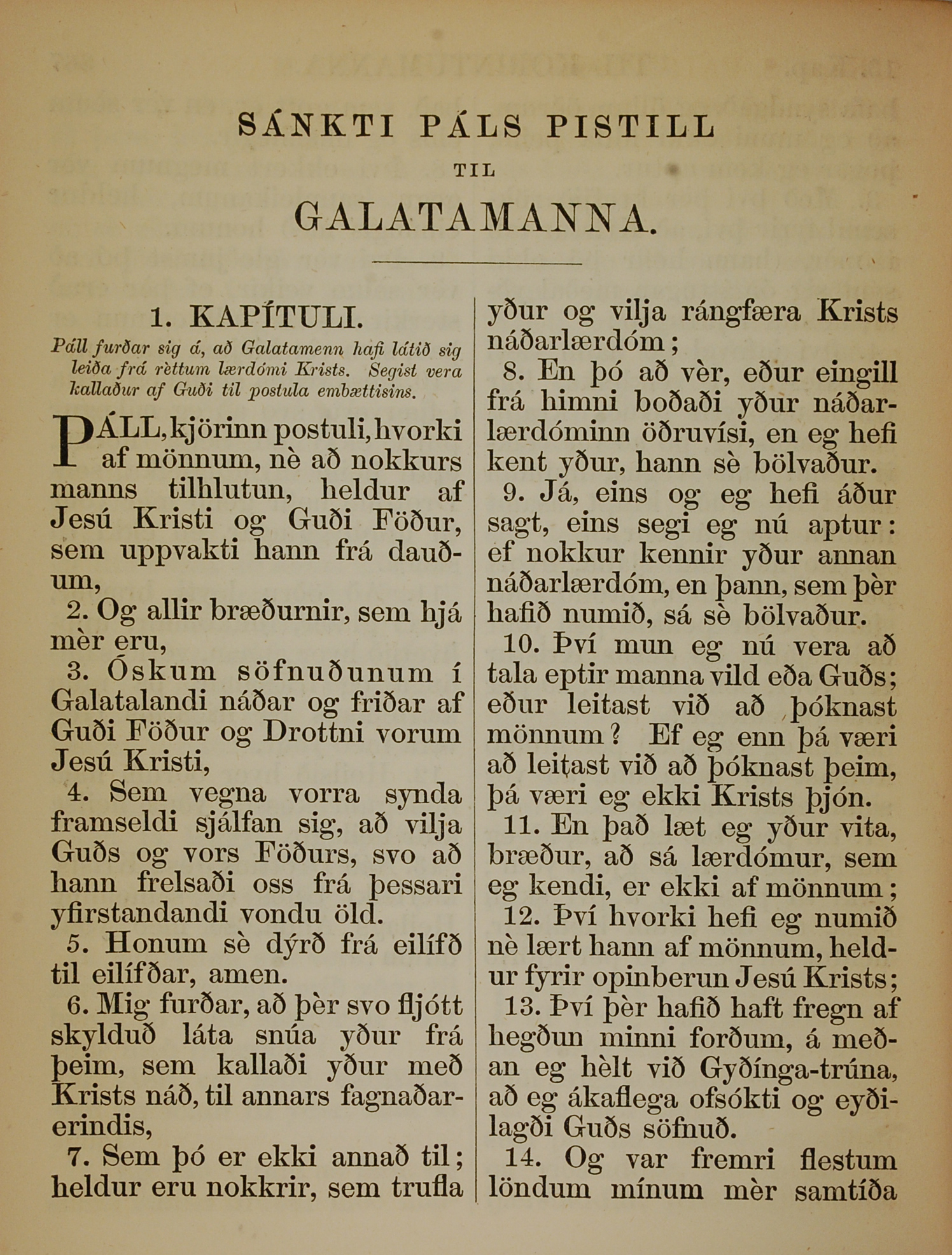 1863年冰島語新約全書 加拉太書 1 章 1 節到 1 章 14 節