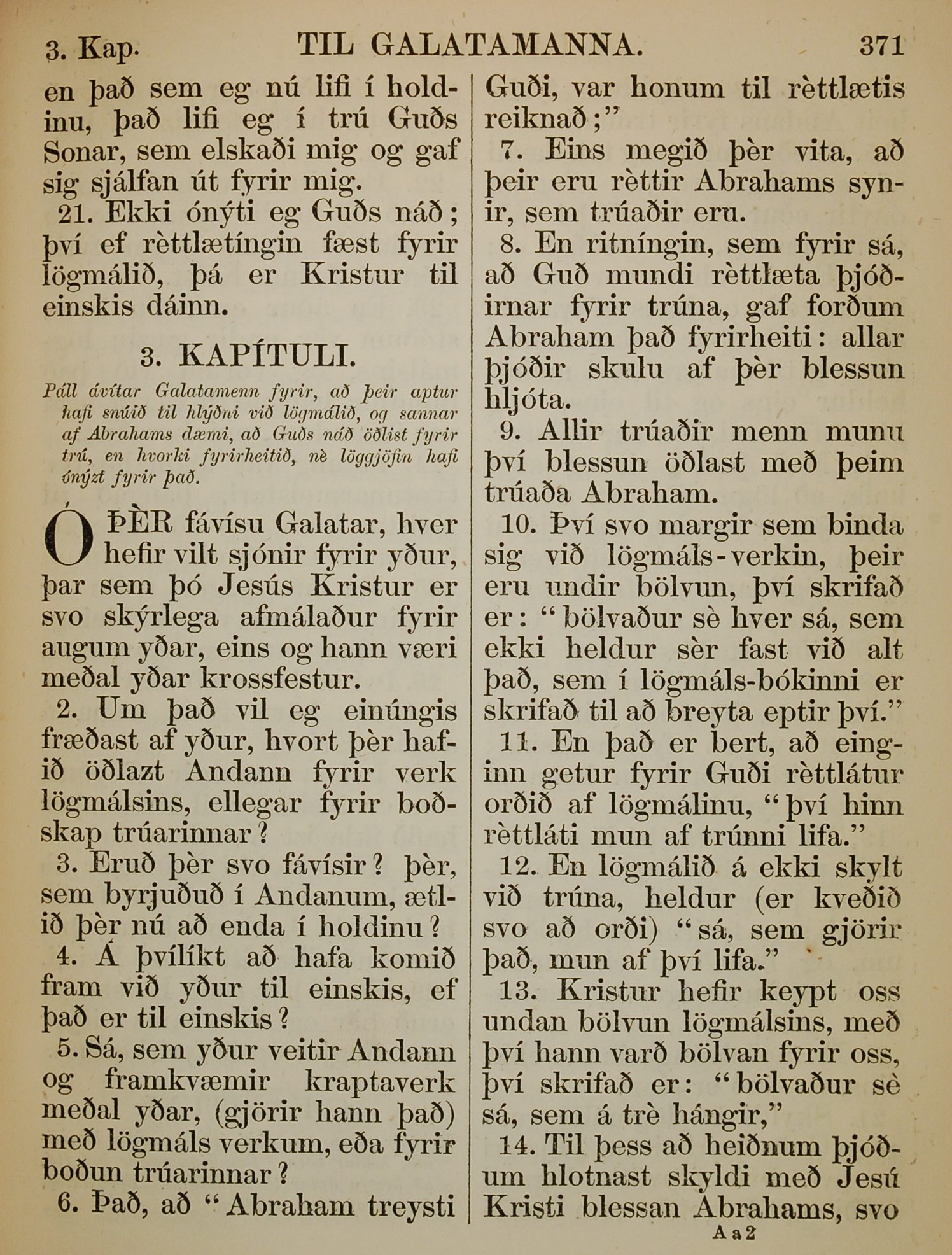1863年冰島語新約全書 加拉太書 2 章 21 節到 3 章 14 節