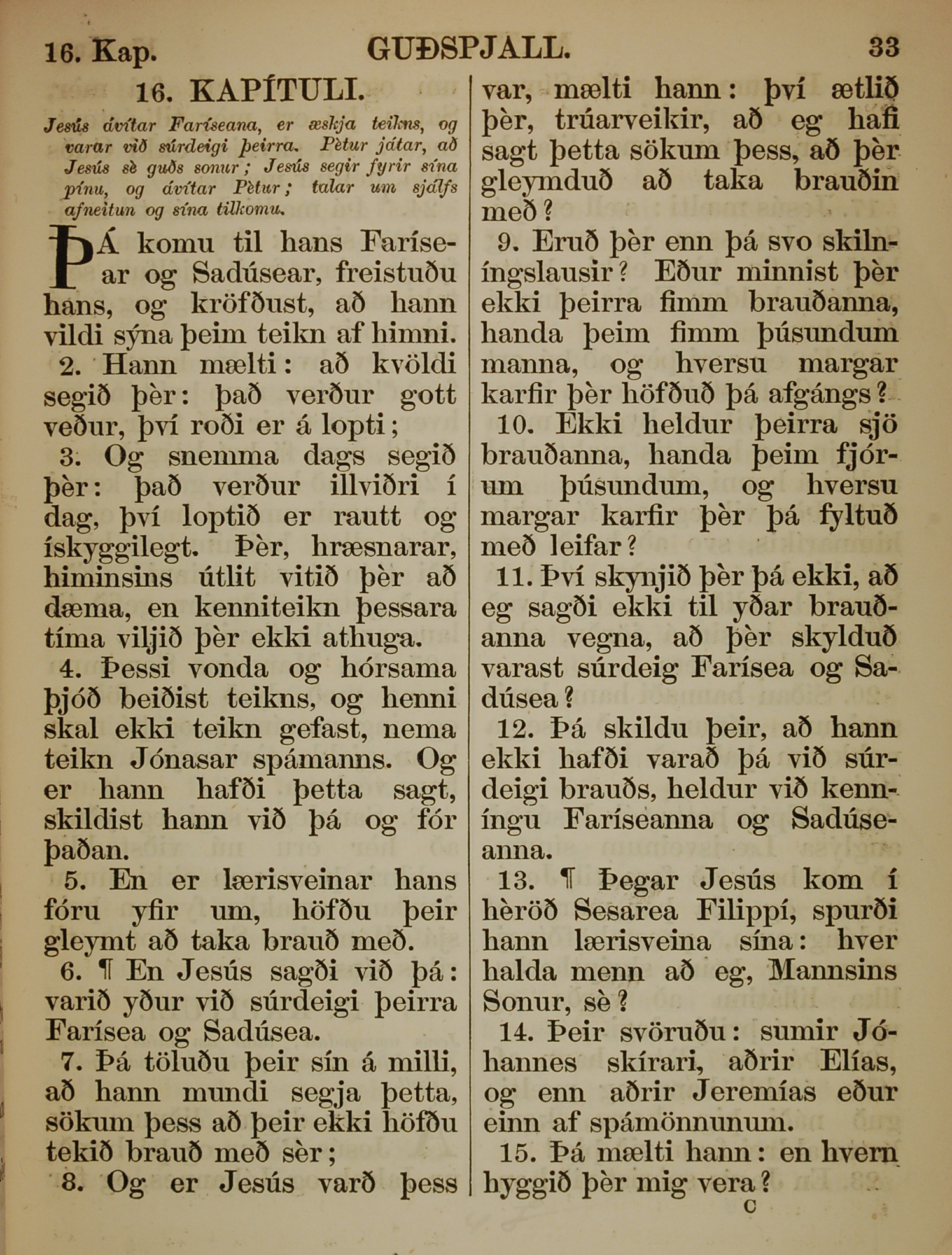 1863年冰島語新約全書 馬太福音 16 章 1 節到 16 章 15 節