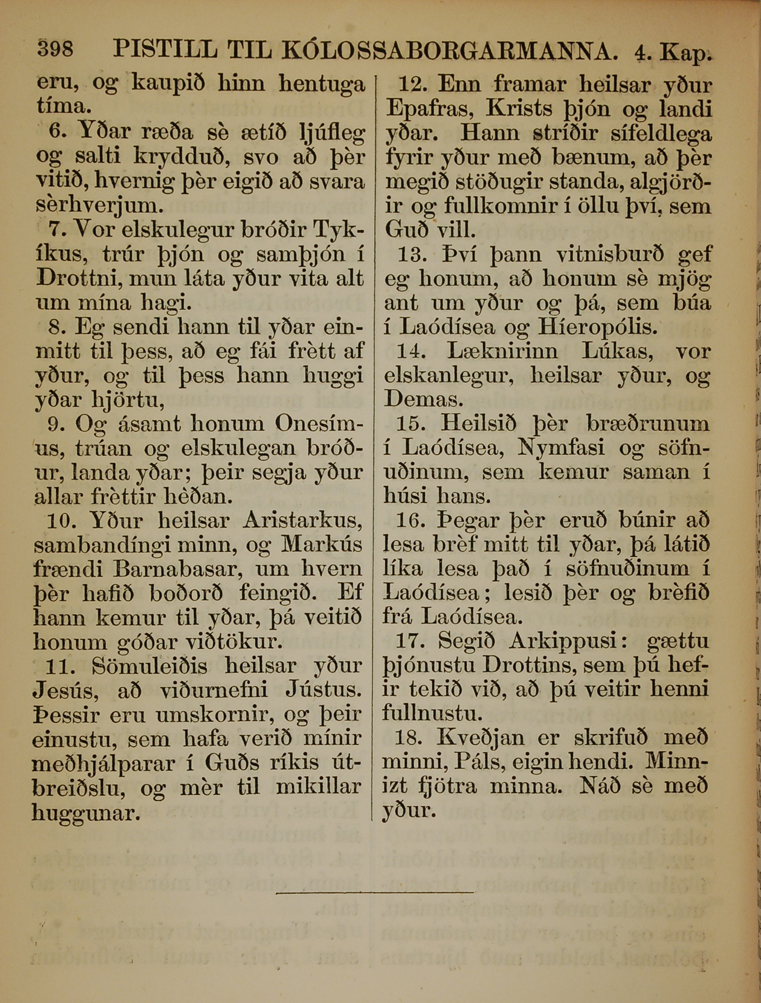 1863年冰島語新約全書 歌羅西書 4 章 6 節到 4 章 18 節