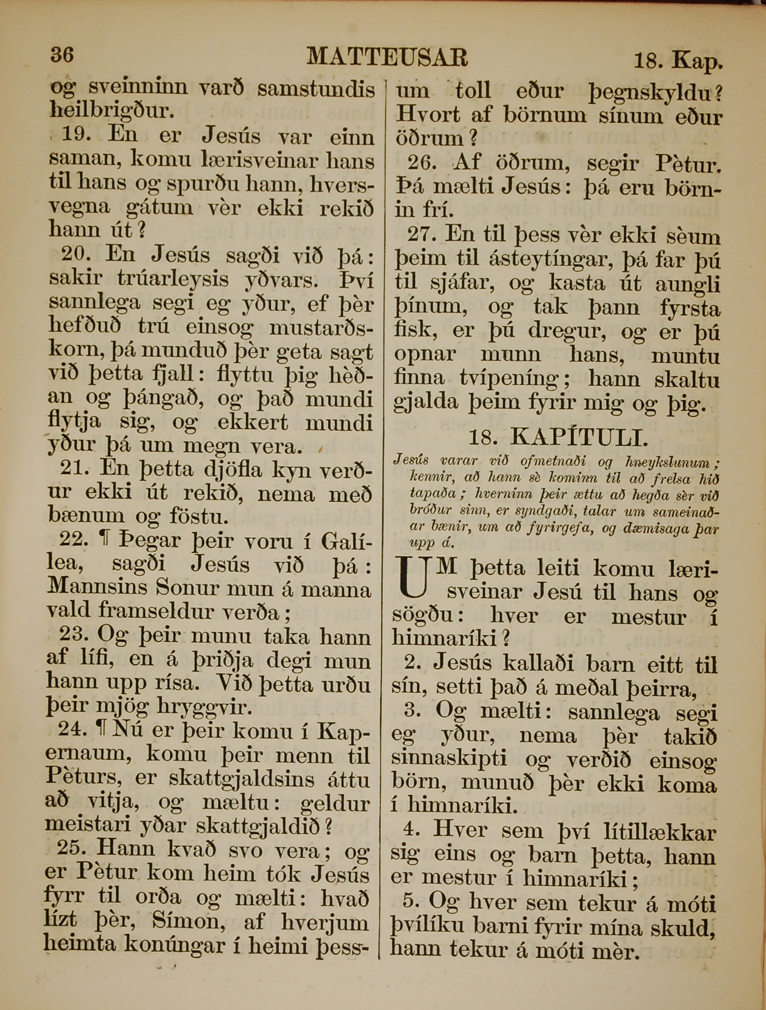 1863年冰島語新約全書 馬太福音 17 章 19 節到 18 章 5 節