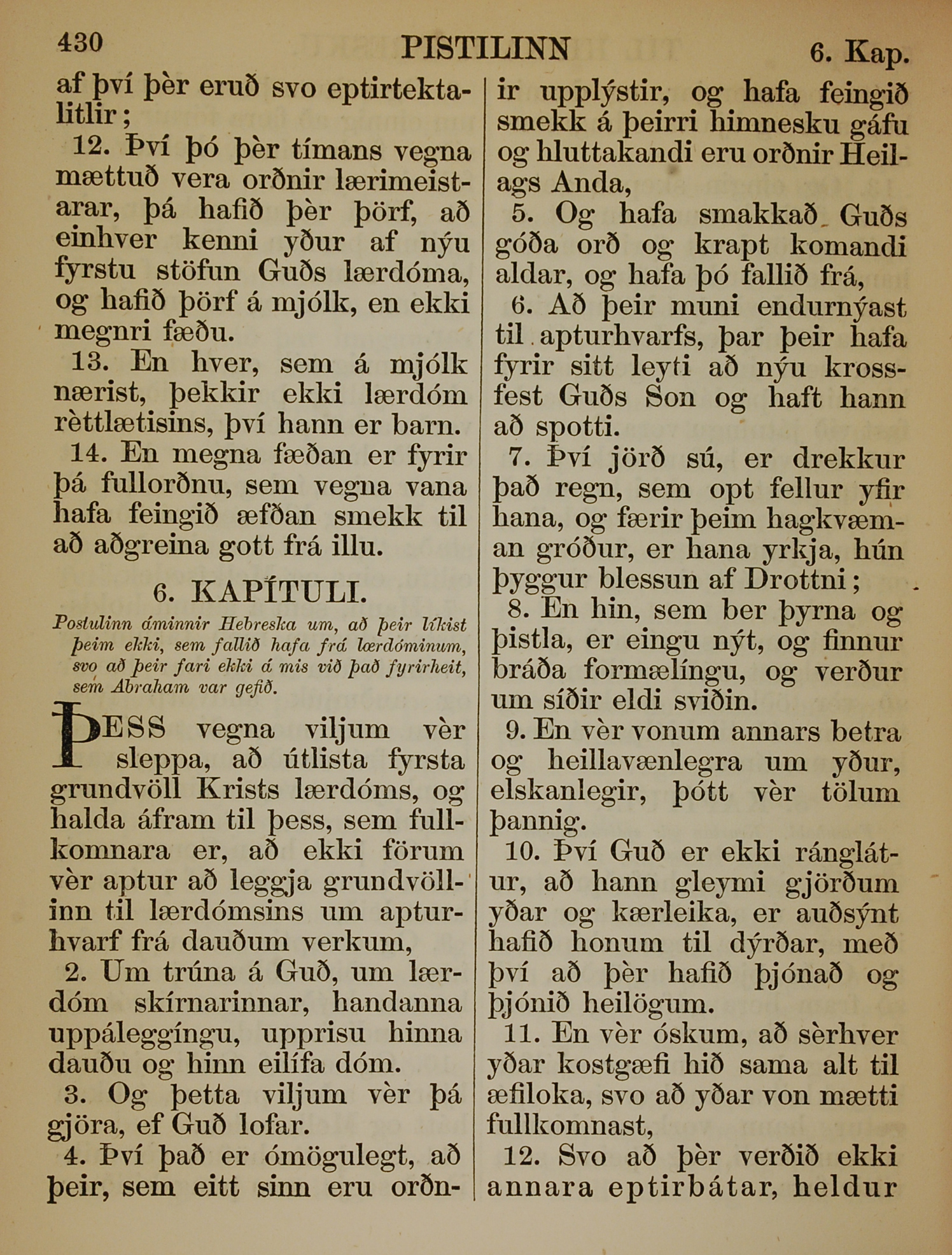 1863年冰島語新約全書 希伯來書 5 章 12 節到 6 章 12 節