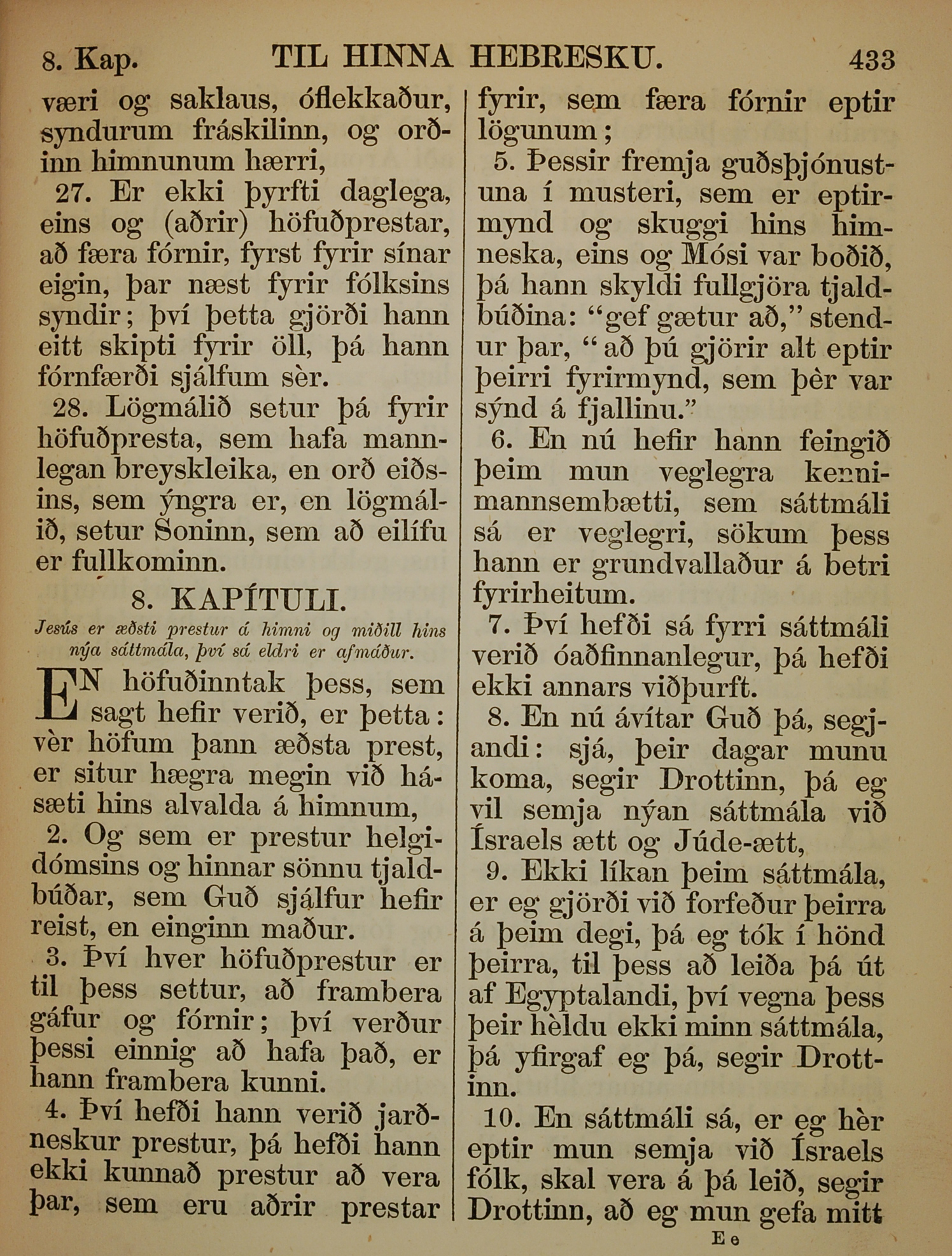 1863年冰島語新約全書 希伯來書 7 章 27 節到 8 章 10 節