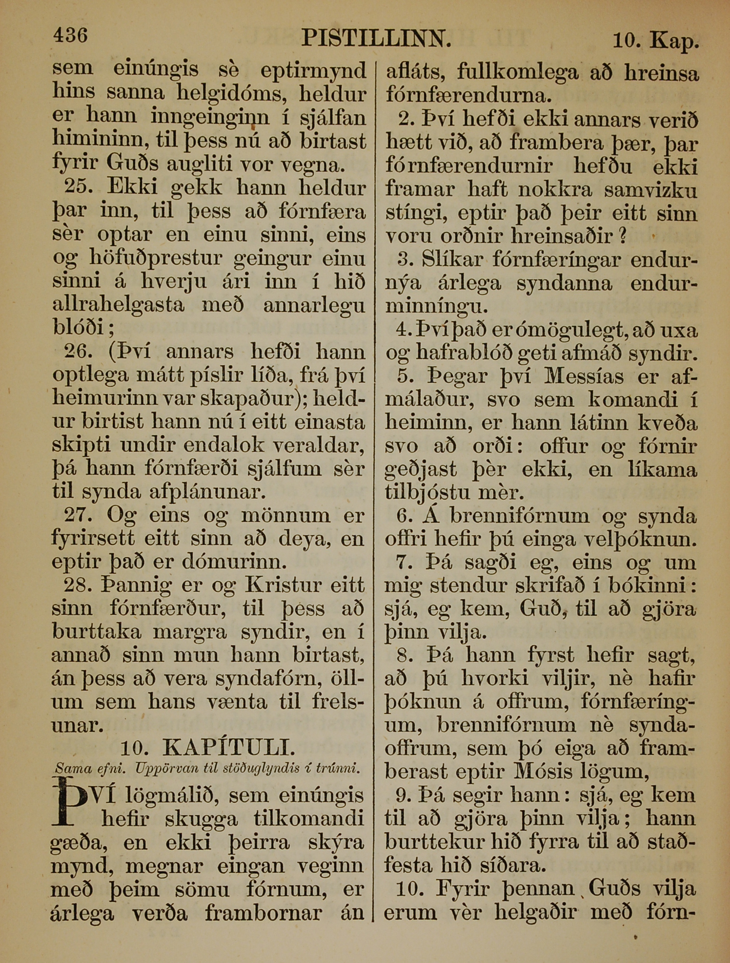1863年冰島語新約全書 希伯來書 9 章 25 節到 10 章 10 節