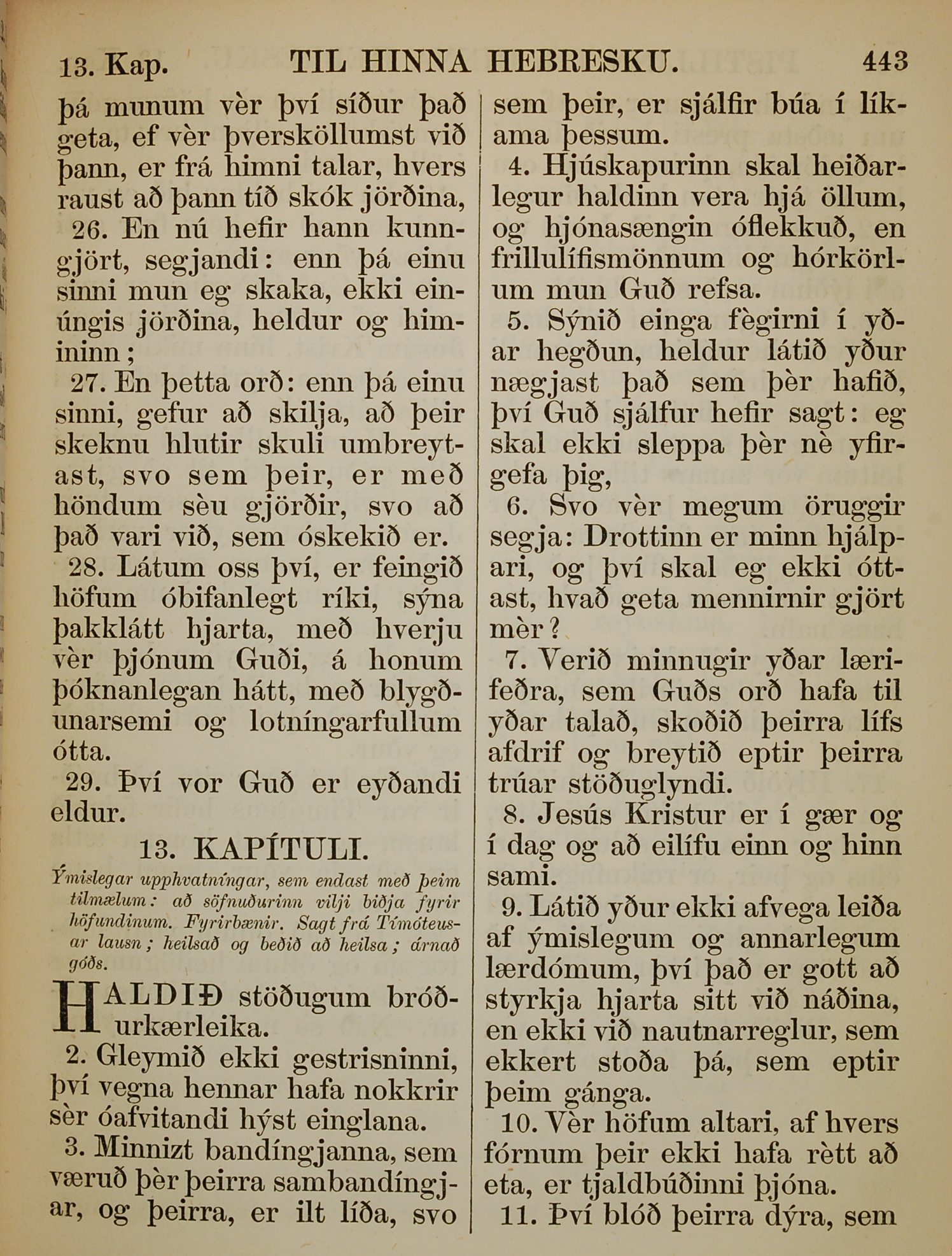 1863年冰島語新約全書 希伯來書 12 章 26 節到 13 章 11 節