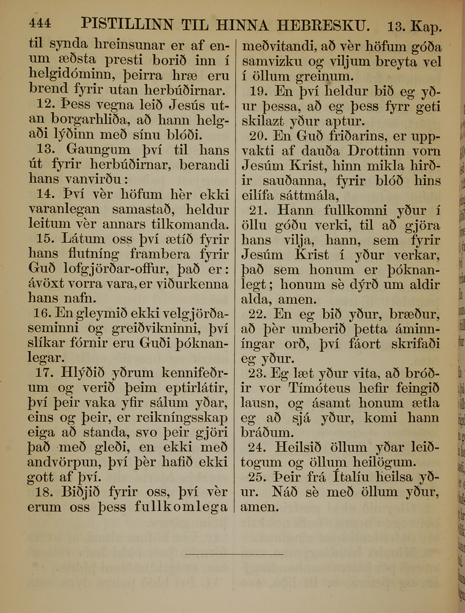 1863年冰島語新約全書 希伯來書 13 章 12 節到 13 章 25 節