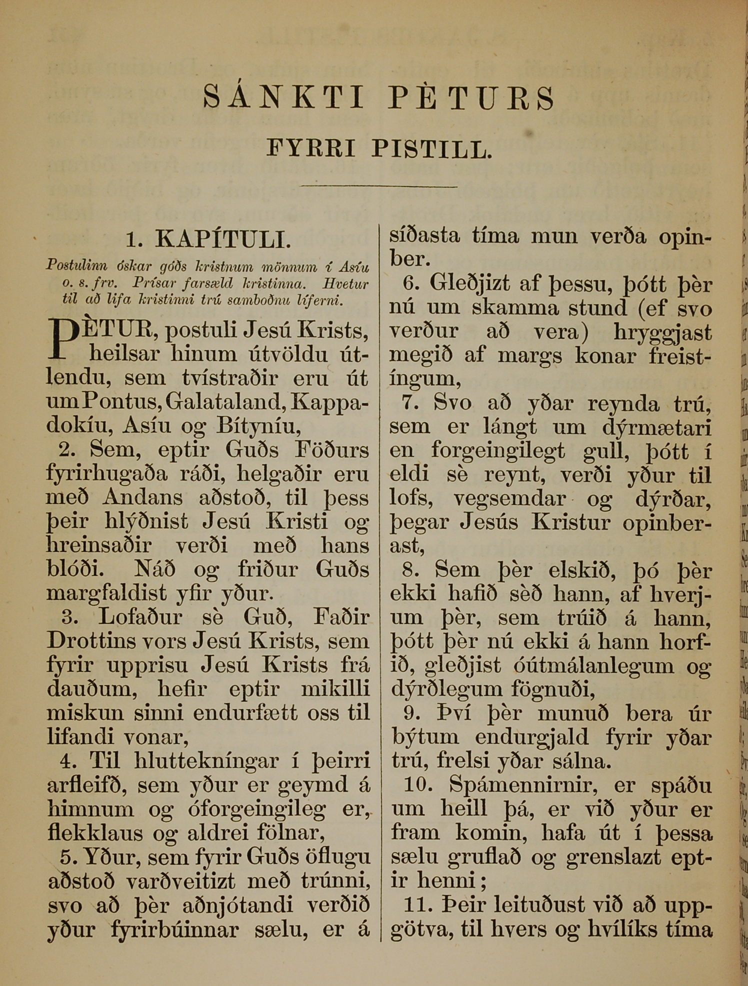 1863年冰島語新約全書 彼得前書 1 章 1 節到 1 章 11 節