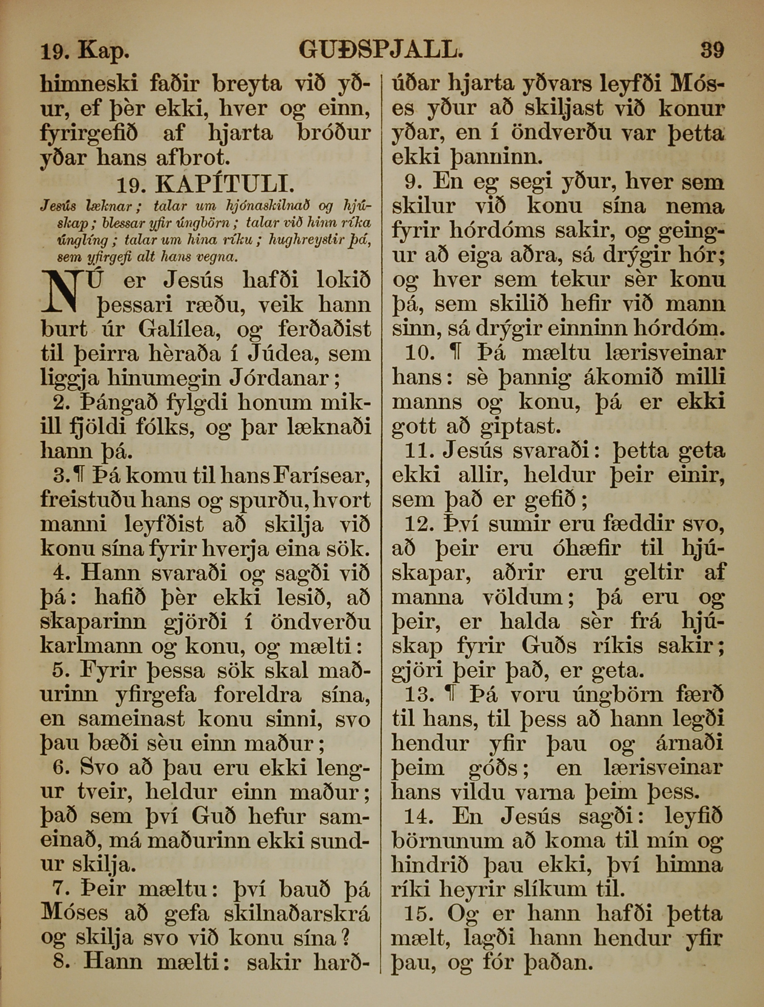 1863年冰島語新約全書 馬太福音 19 章 1 節到 19 章 15 節