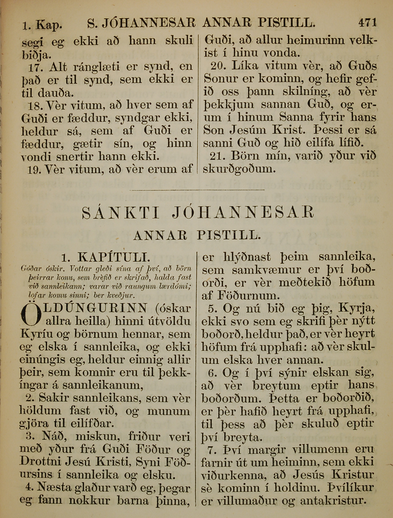 1863年冰島語新約全書 約翰二書 1 章 1 節到 1 章 7 節