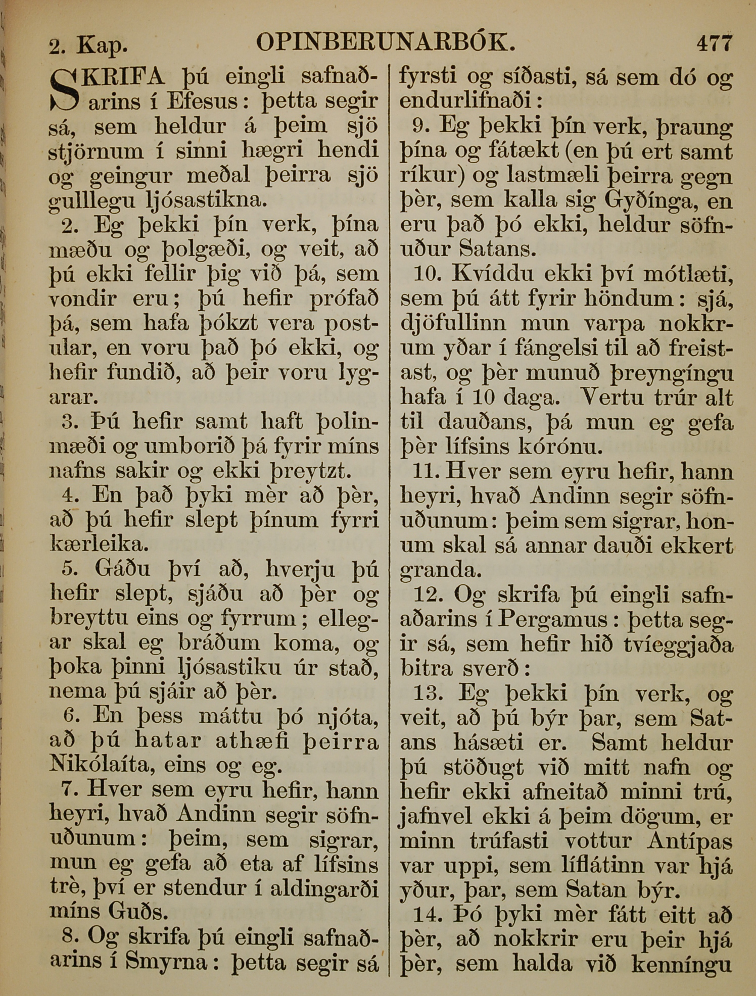 1863年冰島語新約全書 啟示錄 2 章 1 節到 2 章 14 節