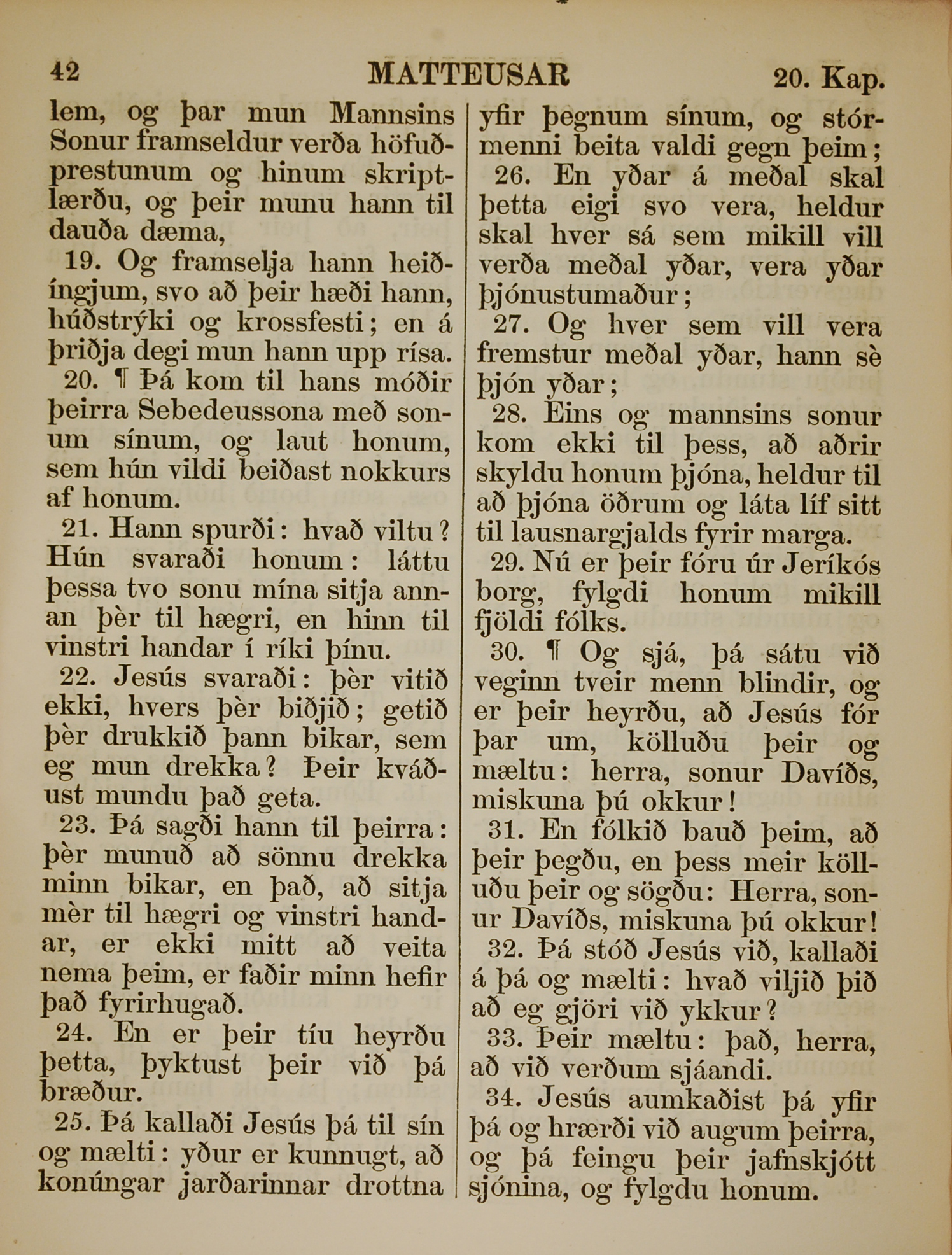1863年冰島語新約全書 馬太福音 20 章 19 節到 20 章 34 節