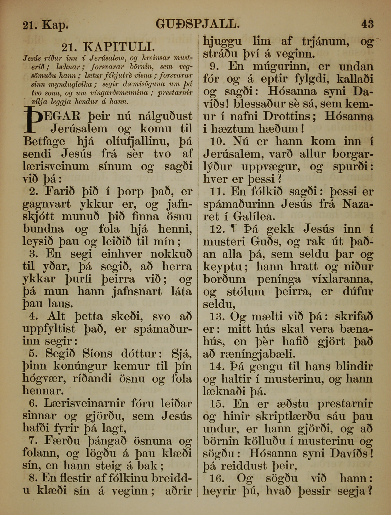 1863年冰島語新約全書 馬太福音 21 章 1 節到 21 章 16 節