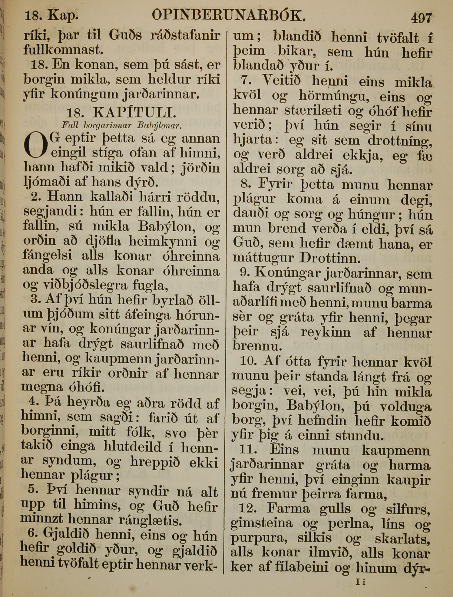 1863年冰島語新約全書 啟示錄 17 章 18 節到 18 章 12 節