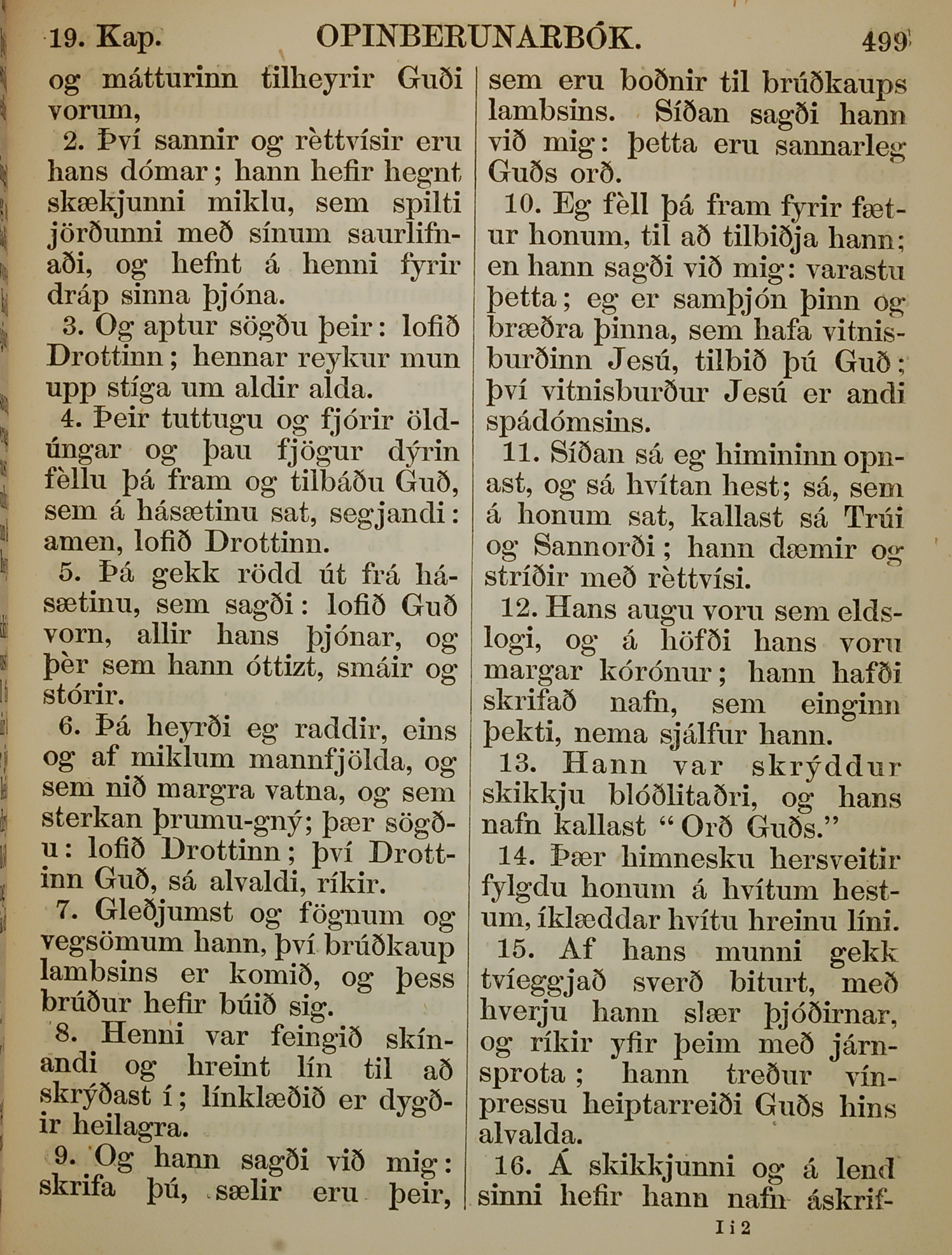 1863年冰島語新約全書 啟示錄 19 章 2 節到 19 章 16 節