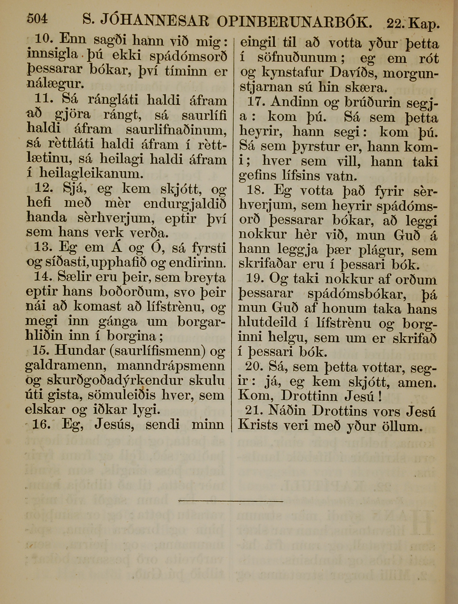 1863年冰島語新約全書 啟示錄 22 章 10 節到 22 章 21 節